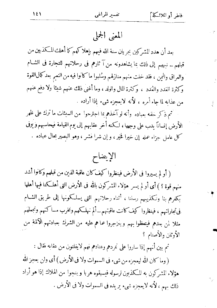 بعد أن هدد المشركين بجريان سنته فيهم، بإهلاكهم كما أهلك المكذبين من قبلهم- نبههم إلى ذلك بما يشاهدونه من آثارهم في رحلاتهم للتجارة في الشام والعراق واليمن، فقد خلت منهم منازلهم وسلبوا ما كانوا فيه من النعيم بعد كمال القوة وكثرة العدد والعدد، وكثرة المال والولد، وما أغنى ذلك عنهم شيئا ولا دفع عنهم من عذابه لما جاء أمره، لأنه لا يعجزه شىء إذا أراده.