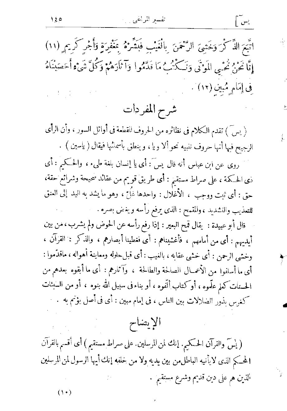 روى عن ابن عباس أنه قال يس: أي يا إنسان بلغة طيىء. والحكيم: أي ذى الحكمة، على صراط مستقيم: أي طريق قويم، من عقائد صحيحة، وشرائع حقة، حق: أي ثبت ووجب، الأغلال: واحدها غلّ، وهو ما تشدّ به اليد إلى العنق للتعذيب والتشديد، والقمح: الذي يرفع رأسه ويغضّ بصره.