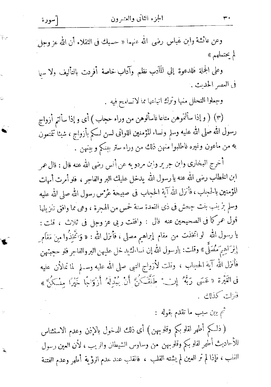 أخرج البخاري وابن جرير وابن مردويه عن أنس رضى الله عنه قال: قال عمر ابن الخطاب رضى الله عنه: يا رسول الله يدخل عليك البرّ والفاجر، فلو أمرت أمهات المؤمنين بالحجاب، فأنزل الله آية الحجاب فى صبيحة عرس رسول الله صلى الله عليه وسلم بزينب بنت جحش فى ذى القعدة سنة خمس من الهجرة، وهى مما وافق تنزيلها قول عمر كما فى الصحيحين عنه قال: وافقت ربى عز وجل فى ثلاث، قلت: