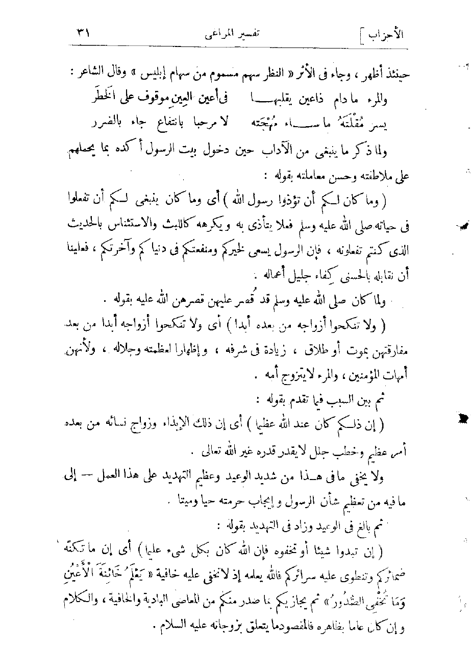 (وَما كانَ لَكُمْ أَنْ تُؤْذُوا رَسُولَ اللَّهِ) أي وما كان ينبغى لكم أن تفعلوا فى حياته صلّى الله عليه وسلم فعلا يتأذى به ويكرهه كاللبث والاستئناس للحديث الذي كنتم تفعلونه، فإن الرسول يسعى لخيركم ومنفعتكم في دنياكم وآخرتكم، فعليكم أن تقابلوا بالحسنى كفاء جليل أعماله.