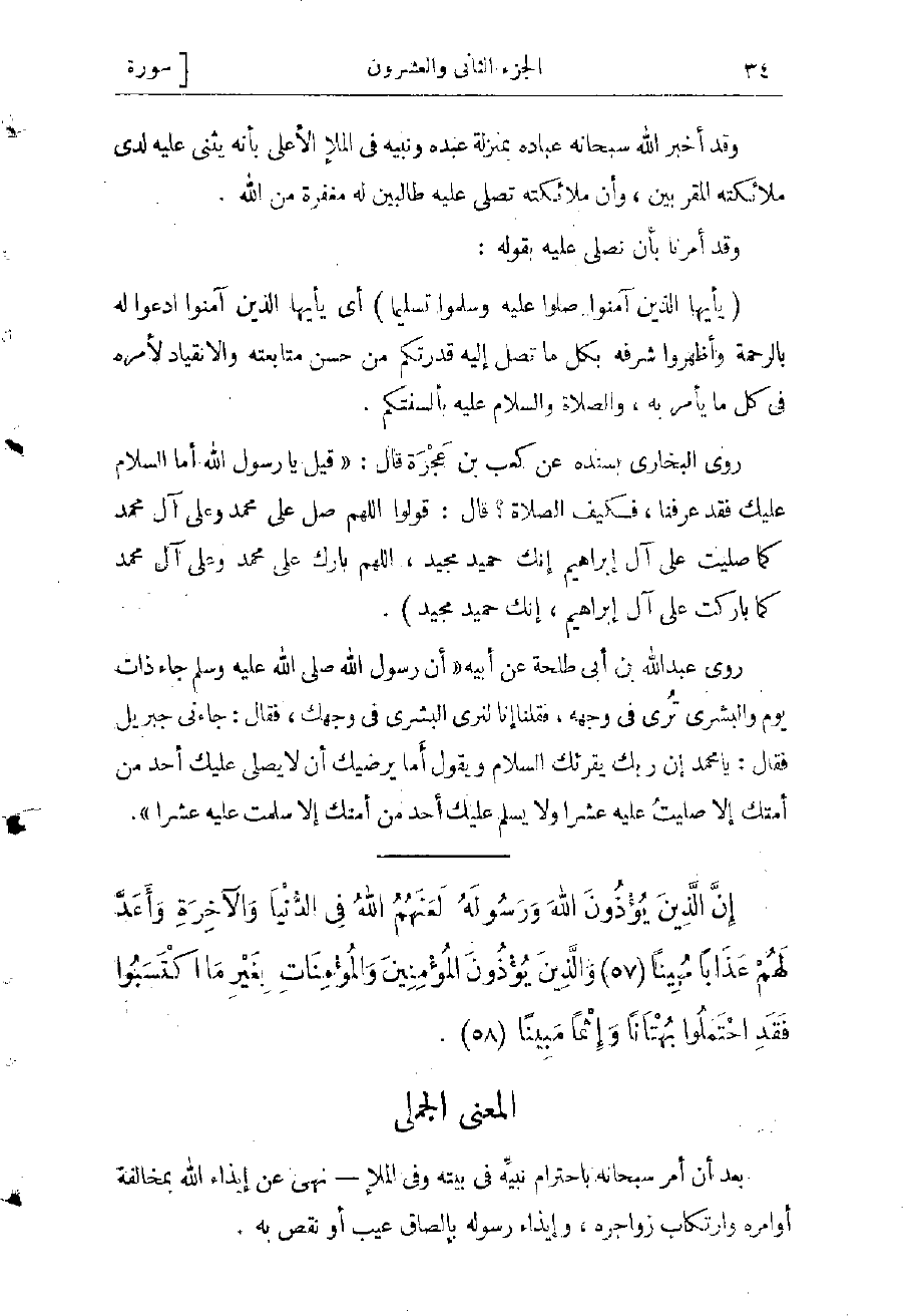 (يا أَيُّهَا الَّذِينَ آمَنُوا صَلُّوا عَلَيْهِ وَسَلِّمُوا تَسْلِيماً) أي يا أيها الذين آمنوا ادعوا له بالرحمة، وأظهروا شرفه بكل ما تصل إليه قدرتكم، من حسن متابعته، والانقياد لأمره، فى كل ما يأمر به، والصلاة والسلام عليه بألسنتكم.