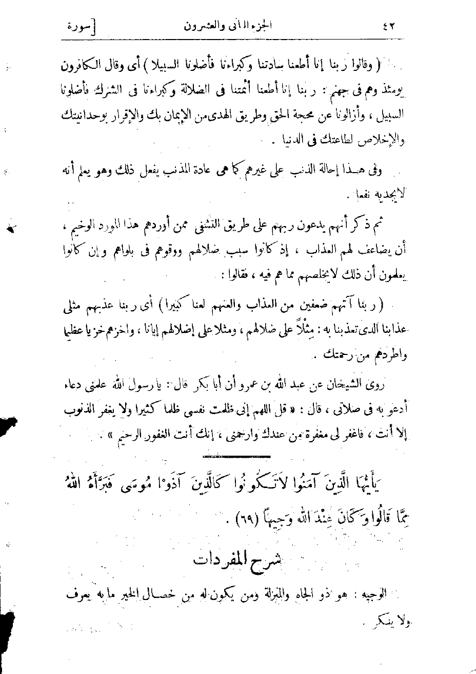(رَبَّنا آتِهِمْ ضِعْفَيْنِ مِنَ الْعَذابِ وَالْعَنْهُمْ لَعْناً كَبِيراً) أي ربنا عذّبهم مثلى عذابنا الذي تعذبنا به: مثلا على ضلالهم، ومثلا على إضلالهم إيانا، واخزهم خزيا عظيما واطردهم من رحمتك.
