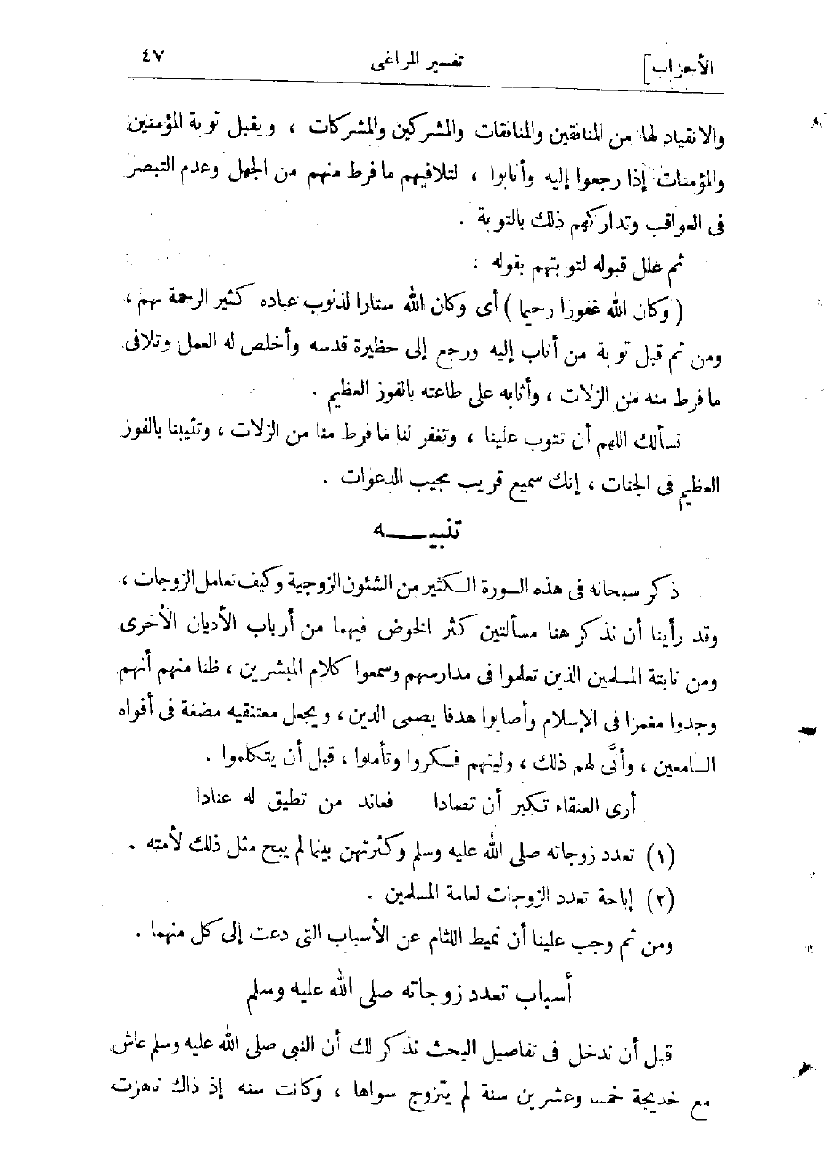 ذكر سبحانه في هذه السورة الكثير من الشئون الزوجية وكيف تعامل الزوجات، وقد رأينا أن نذكر هنا مسألتين كثر الخوض فيهما من أرباب الأديان الأخرى ومن نابتة المسلمين الذين تعلموا في مدارسهم وسمعوا كلام المبشرين، ظنا منهم أنهم وجدوا مغمزا في الإسلام وأصابوا هدفا يصمى الدين، ويجعل معتنقيه مضغة في أفواه السامعين وأنى لهم ذلك، وليتهم فكروا وتأملوا، قبل أن يتكلموا.