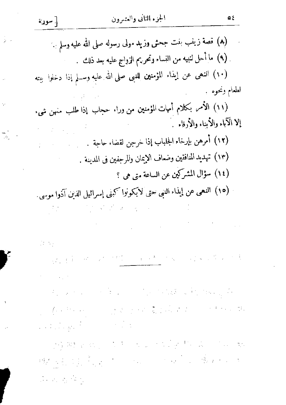 (10) النهى عن إيذاء المؤمنين للنبى صلّى الله عليه وسلم إذا دخلوا بيته لطعام ونحوه (11) الأمر بكلام أمهات المؤمنين من وراء حجاب إذا طلب منهن شىء إلا الآباء والأبناء والأرقاء.