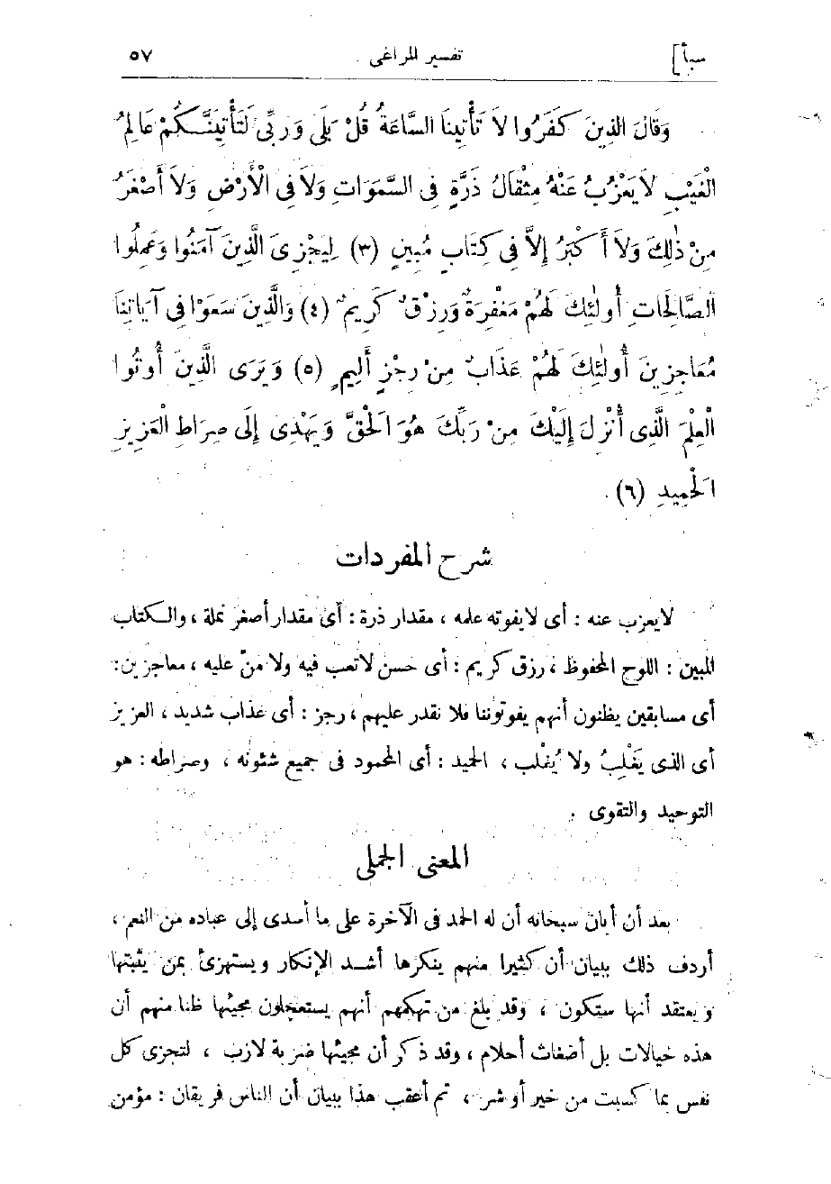 لا يعزب عنه: أي لا يفوته علمه، مثقال ذرة: أي مقدار أصغر نملة، والكتاب المبين: اللوح المحفوظ، رزق كريم: أي حسن لا تعب فيه ولا منّ عليه، معاجزين: