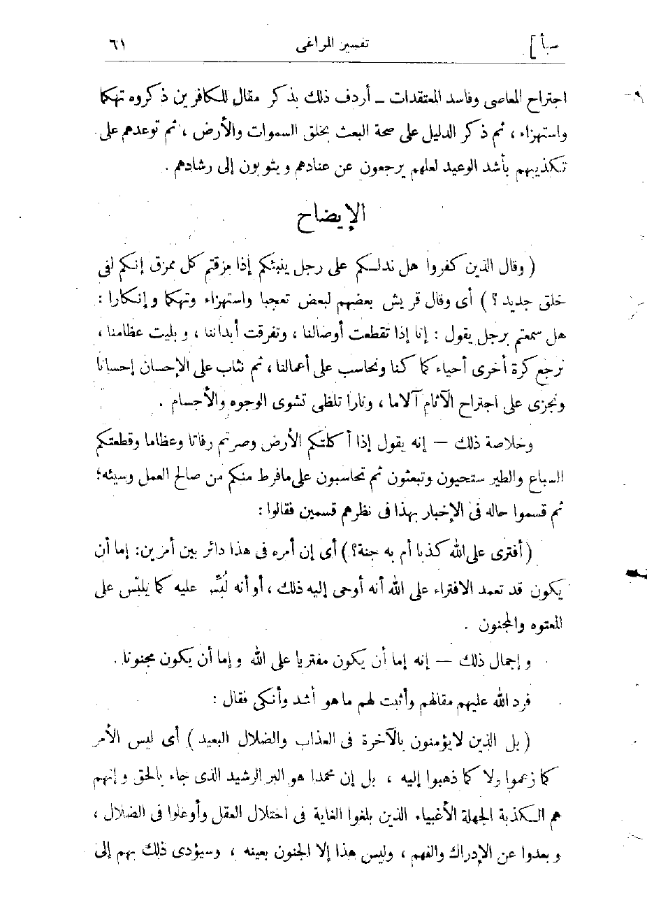 (بَلِ الَّذِينَ لا يُؤْمِنُونَ بِالْآخِرَةِ فِي الْعَذابِ وَالضَّلالِ الْبَعِيدِ) أي ليس الأمر كما زعموا ولا كما ذهبوا إليه، بل إن محمدا هو البرّ الرشيد الذي جاء بالحق، وإنهم هم الكذبة الجهلة الأغبياء الذين بلغوا الغاية في اختلال العقل وأوغلوا في الضلال، وبعدوا