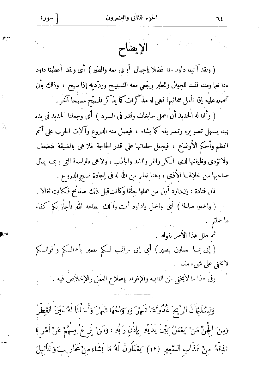 (وَلَقَدْ آتَيْنا داوُدَ مِنَّا فَضْلًا يا جِبالُ أَوِّبِي مَعَهُ وَالطَّيْرَ) أي ولقد أعطينا داود منا نعما ومننا فقلنا للجبال وللطير رجّعى معه التسبيح وردّ ديه إذا سبّح، وذلك بأن تحمله عليه إذا تأمل عجائبها فهى له مذكّرات كما يذكّر المسبّح مسبحا آخر (وَأَلَنَّا لَهُ الْحَدِيدَ أَنِ اعْمَلْ سابِغاتٍ وَقَدِّرْ فِي السَّرْدِ) أي وجعلنا الحديد في يده لينا يسهل تصويره وتصريفه كما يشاء، فيعمل منه الدروع وآلات الحرب على أتم النظم وأحكم الأوضاع، فيجعل حلقاتها على قدر الحاجة فلا هى بالضيقة فتضعف ولا تؤدى وظيفتها لدى الكر والفر والشد والجذب، ولا هى بالواسعة التي ربما ينال صاحبها من خلالها الأذى، وهذا تعليم من الله له في إجادة نسج الدروع.