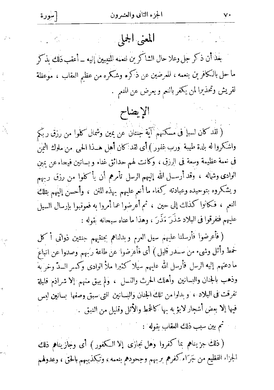 (لَقَدْ كانَ لِسَبَإٍ فِي مَسْكَنِهِمْ آيَةٌ جَنَّتانِ عَنْ يَمِينٍ وَشِمالٍ كُلُوا مِنْ رِزْقِ رَبِّكُمْ وَاشْكُرُوا لَهُ بَلْدَةٌ طَيِّبَةٌ وَرَبٌّ غَفُورٌ) أي لقد كان أهل هذا الحي من ملوك اليمن فى نعمة عظيمة وسعة في الرزق، وكانت لهم حدائق غناء، وبساتين فيحاء، عن يمين الوادي وشماله، وقد أرسل الله إليهم الرسل تأمرهم أن يأكلوا من رزق ربهم ويشكروه بتوحيده وعبادته كفاء ما أنعم عليهم بهذه المنن، وأحسن إليهم بتلك النعم، فكانوا كذلك إلى حين، ثم أعرضوا عما أمروا به فعوقبوا بإرسال السيل عليهم فتفرقوا في البلاد شذر مذر، وهذا ما عناه سبحانه بقوله: