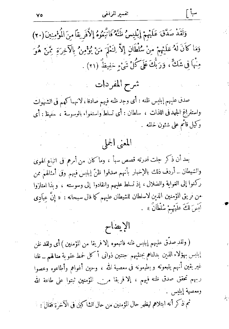 بعد أن ذكر جلت قدرته قصص سبأ، وما كان من أمرهم في اتباع الهوى والشيطان- أردف ذلك الإخبار بأنهم صدّقوا ظنّ إبليس فيهم وفي أمثالهم ممن ركنوا إلى الغواية والضلال، إذ تسلط عليهم وانقادوا إلى وسوسته، وبذا امتازوا من فريق المؤمنين الذين لا سلطان للشيطان عليهم كما قال سبحانه «إِنَّ عِبادِي لَيْسَ لَكَ عَلَيْهِمْ سُلْطانٌ» .