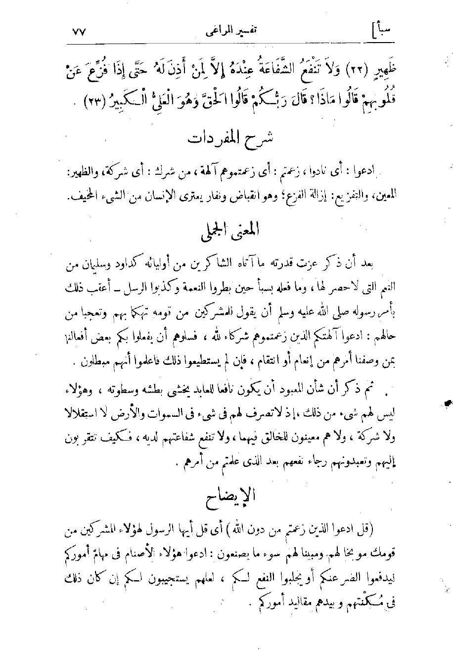 بعد أن ذكر عزت قدرته ما آتاه الشاكرين من أوليائه كداود وسليمان من النعم التي لا حصر لها، وما فعله بسبأ حين بطروا النعمة وكذبوا الرسل- أعقب ذلك بأمر رسوله صلّى الله عليه وسلم أن يقول للمشركين من قومه تهكما بهم وتعجبا من حالهم: ادعوا آلهتكم الذين زعمتموهم شركاء لله، فسلوهم أن يفعلوا بكم بعض أفعالنا بمن وصفنا أمرهم من إنعام أو انتقام، فإن لم يستطيعوا ذلك فاعلموا أنهم مبطلون.