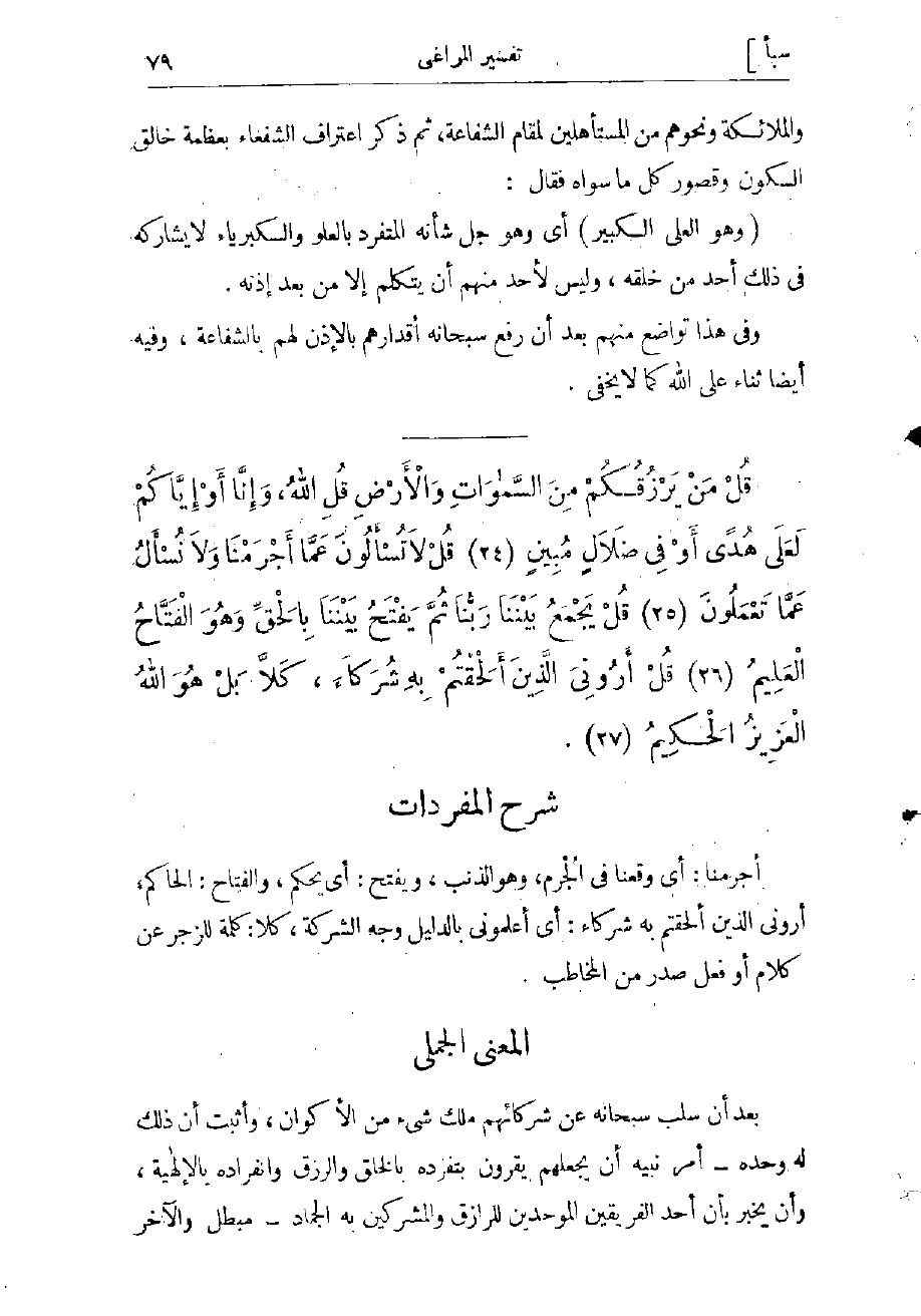 أجرمنا: أي وقعنا في الجرم، وهو الذنب، ويفتح: أي يحكم، والفتاح: الحاكم أرونى الذين ألحقتم به شركاء: أي أعلمونى بالدليل وجه الشركة، كلا: كلمة للزجر عن كلام أو فعل صدر من المخاطب.