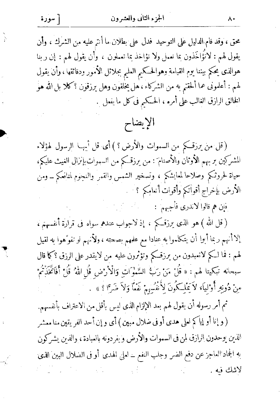 (قُلْ مَنْ يَرْزُقُكُمْ مِنَ السَّماواتِ وَالْأَرْضِ؟) أي قل أيها الرسول لهؤلاء المشركين بربهم الأوثان والأصنام: من يرزقكم من السموات بإنزال الغيث عليكم، حياة لحروثكم وصلاحا لمعايشكم، وتسخير الشمس والقمر والنجوم لمنافعكم- ومن الأرض بإخراج أقواتكم وأقوات أنعامكم؟