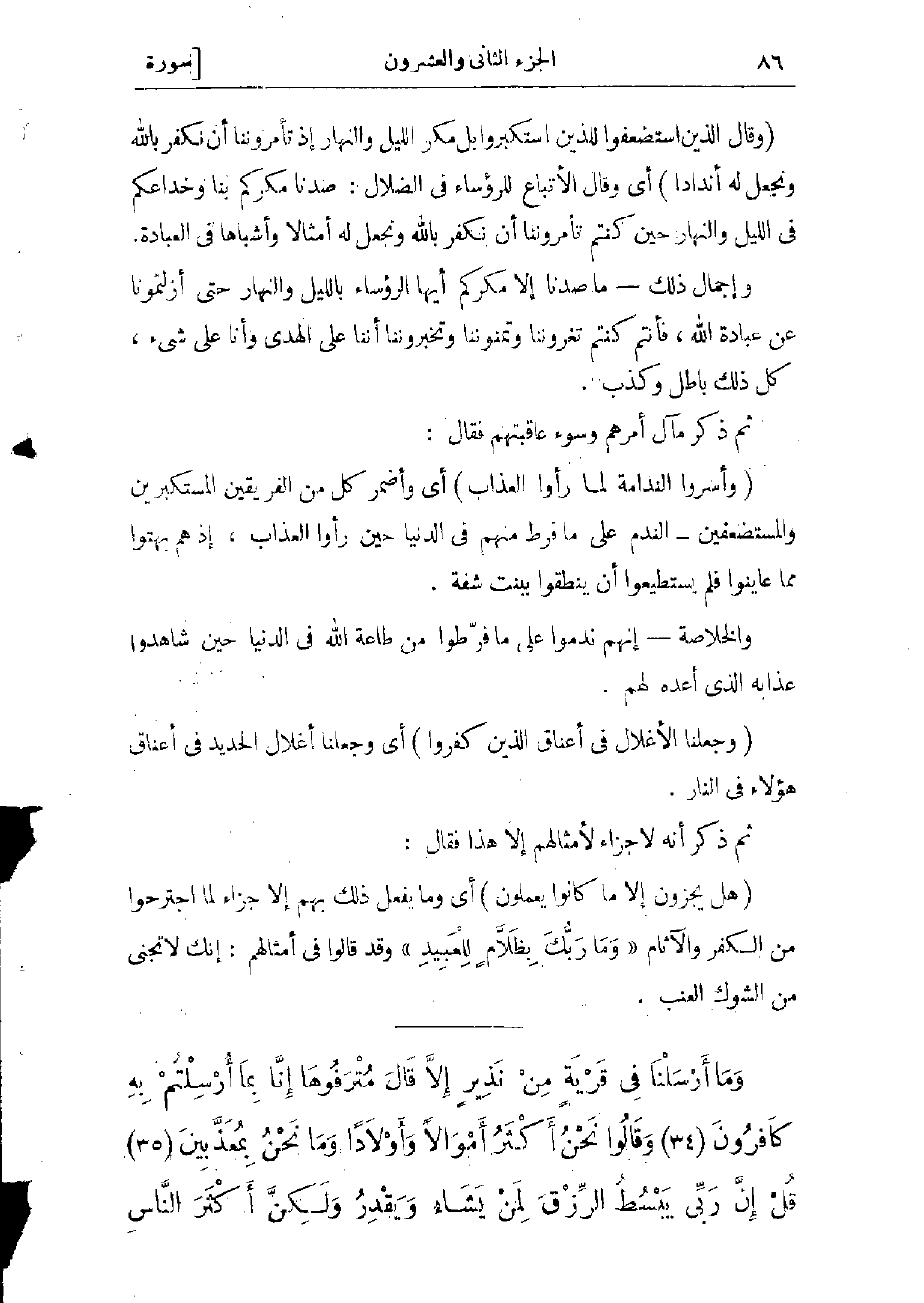 (وَقالَ الَّذِينَ اسْتُضْعِفُوا لِلَّذِينَ اسْتَكْبَرُوا بَلْ مَكْرُ اللَّيْلِ وَالنَّهارِ إِذْ تَأْمُرُونَنا أَنْ نَكْفُرَ بِاللَّهِ وَنَجْعَلَ لَهُ أَنْداداً) أي وقال الأتباع للرؤساء في الضلال: صدنا مكركم بنا وخداعكم فى الليل والنهار حين كنتم تأمروننا أن نكفر بالله ونجعل له أمثالا وأشباها في العبادة وإجمال ذلك- ما صدنا إلا مكركم أيها الرؤساء بالليل والنهار حتى أزلتمونا عن عبادة الله، فأنتم كنتم تغروننا وتمنوننا وتخبروننا أننا على الهدى وأنّا على شىء، وكل ذلك باطل وكذب.