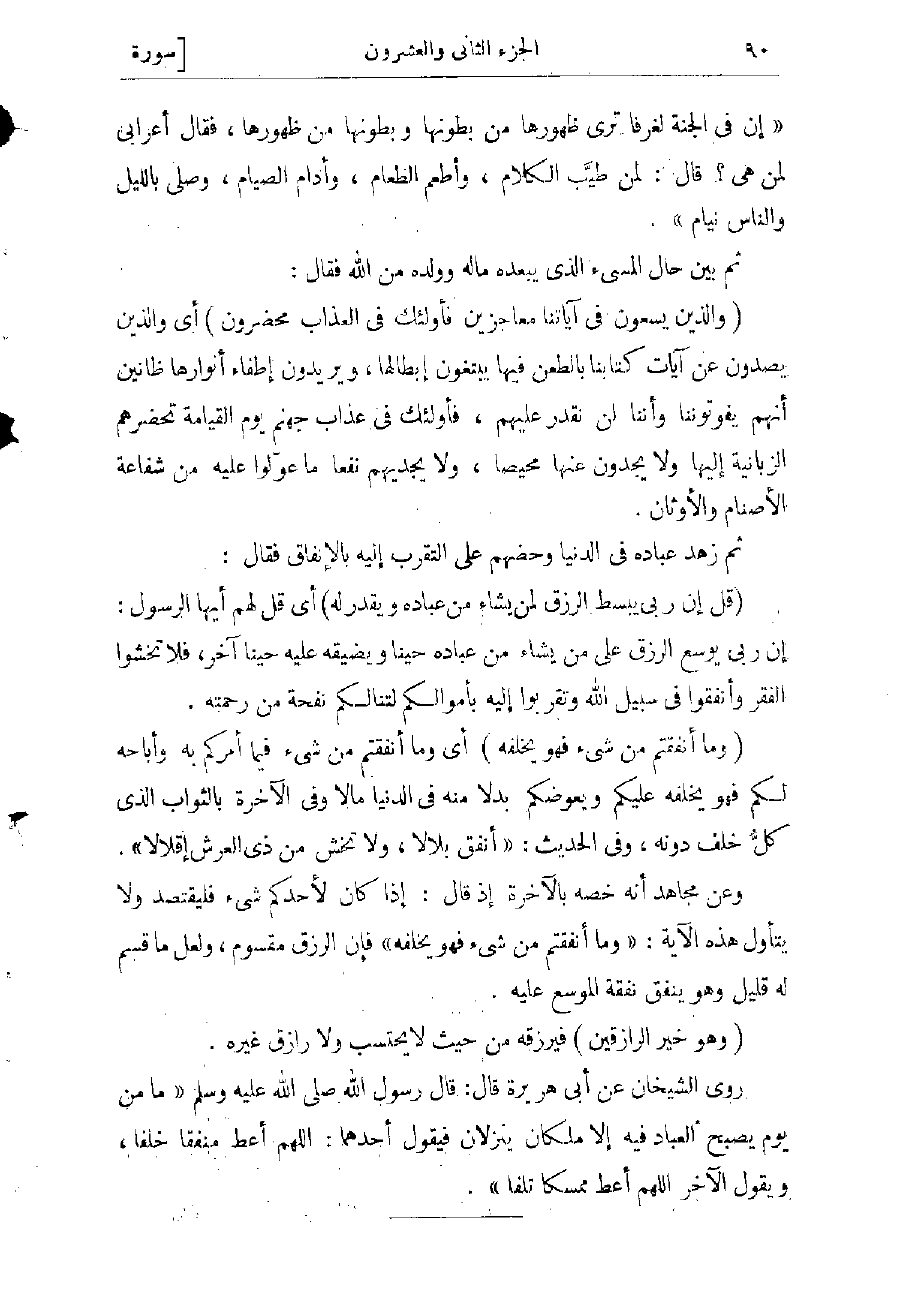 «إن في الجنة لغرفا ترى ظهورها من بطونها، وبطونها من ظهورها، فقال أعرابى لمن هى؟ قال لمن طيب الكلام، وأطعم الطعام، وأدام الصيام، وصلّى بالليل والناس نيام» .