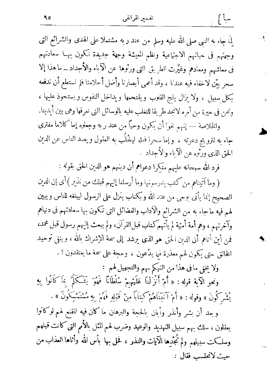 (وَما آتَيْناهُمْ مِنْ كُتُبٍ يَدْرُسُونَها وَما أَرْسَلْنا إِلَيْهِمْ قَبْلَكَ مِنْ نَذِيرٍ) أي إن الدين الصحيح إنما يأتى بوحي من عند الله وبكتاب ينزل على الرسول ليبلغه للناس ويبين لهم فيه ما جاء به من الشرائع والآداب والفضائل التي تكون بها سعادتهم في دنياهم وآخرتهم، وهم أمة أميّة لم يأتهم كتاب قبل القرآن، ولم يبعث إليهم رسول قبل محمد، فمن أين أتاهم أن الدين الحق هو الذي يرشد إلى صحة الإشراك بالله، وينفى توحيد الخالق حتى يكون لهم معذرة فيما يدّعون، وحجة على صحة ما يعتقدون؟.