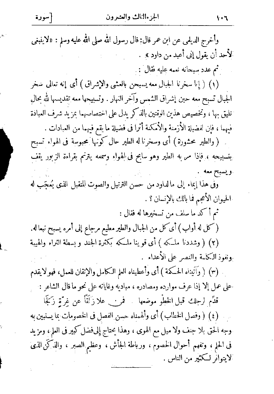 (كُلٌّ لَهُ أَوَّابٌ) أي كل من الجبال والطير مطيع مرجاع إلى أمره يسبح تبعا له (2) (وَشَدَدْنا مُلْكَهُ) أي قوينا ملكه بكثرة الجند وبسطة الثراء والهيبة ونفوذ الكلمة والنصر على الأعداء (3) (وَآتَيْناهُ الْحِكْمَةَ) أي وأعطيناه العلم الكامل، والإتقان للعمل، فهو لا يقدم على عمل إلا إذا عرف موارده ومصادره، مباديه وغاياته على نحو ما قال الشاعر: