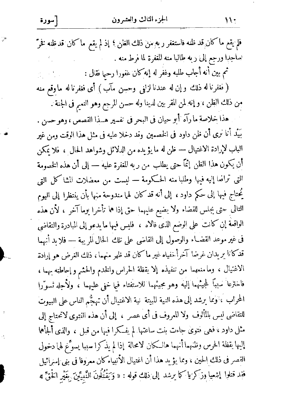 بيد أنا نرى أن ظن داود في الخصمين وقد دخلا عليه في مثل هذا الوقت ومن غير الباب لإرادة الاغتيال- ظن له ما يؤيده من الدلائل وشواهد الحال، فلا يمكن أن يكون إثما حتى يطلب من ربه المغفرة عليه- إلى أن هذه الخصومة التي ترافعا إليه فيها وطلبا منه الحكومة- ليست من معضلات المشاكل التي يحتاج فيها إلى حكم داود، إلى أنه قد كان لهما مندوحة منها بأن ينتظرا إلى اليوم التالي حتى يجلس للقضاء ولا يضيع عليهما حق إذا هما تأخرا يوما آخر، لأن هذه الواقعة إن كانت على الوضع الذي قالاه، فليس فيها ما يدعو إلى المبادرة والتقاضي فى غير موعد القضاء والوصول إلى القاضي على تلك الحال المريبة- فلا بد أنهما قد كانا يريدان غرضا آخر أخفياه غير ما كان قد ظهر منهما، ذلك الغرض هو إرادة الاغتيال، وما منعهما من تنفيذه إلا يقظة الحراس والخدم والحشم وإحاطته بهما، فاخترعا سببا لمجيئهما إليه وهو مجيئها للاستفتاء فيما خفى عليهما، ولأجله تسوّرا المحراب، ومما يرشد إلى هذه النية المبيّتة نية الاغتيال أنّ تهجّم الناس على البيوت للتقاضى ليس بالمألوف ولا المعروف في أي عصر، إلى أن هذه الفتوى لا تحتاج إلى مثل داود، فهى فتوى جاءت بنت ساعتها لم يفكرا فيها من قبل، والذي ألجأهما إليها يقظة الحرس وظنهما أنهما هالكان لا محالة إذا لم يذكرا سببا يسوّغ لهما دخول القصر في ذلك الحين، ومما يؤيد هذا أن اغتيال الأنبياء كان معروفا في بنى إسرائيل فقد قتلوا أشعيا وزكريا كما يرشد إلى ذلك قوله: «وَيَقْتُلُونَ النَّبِيِّينَ بِغَيْرِ الْحَقِّ»