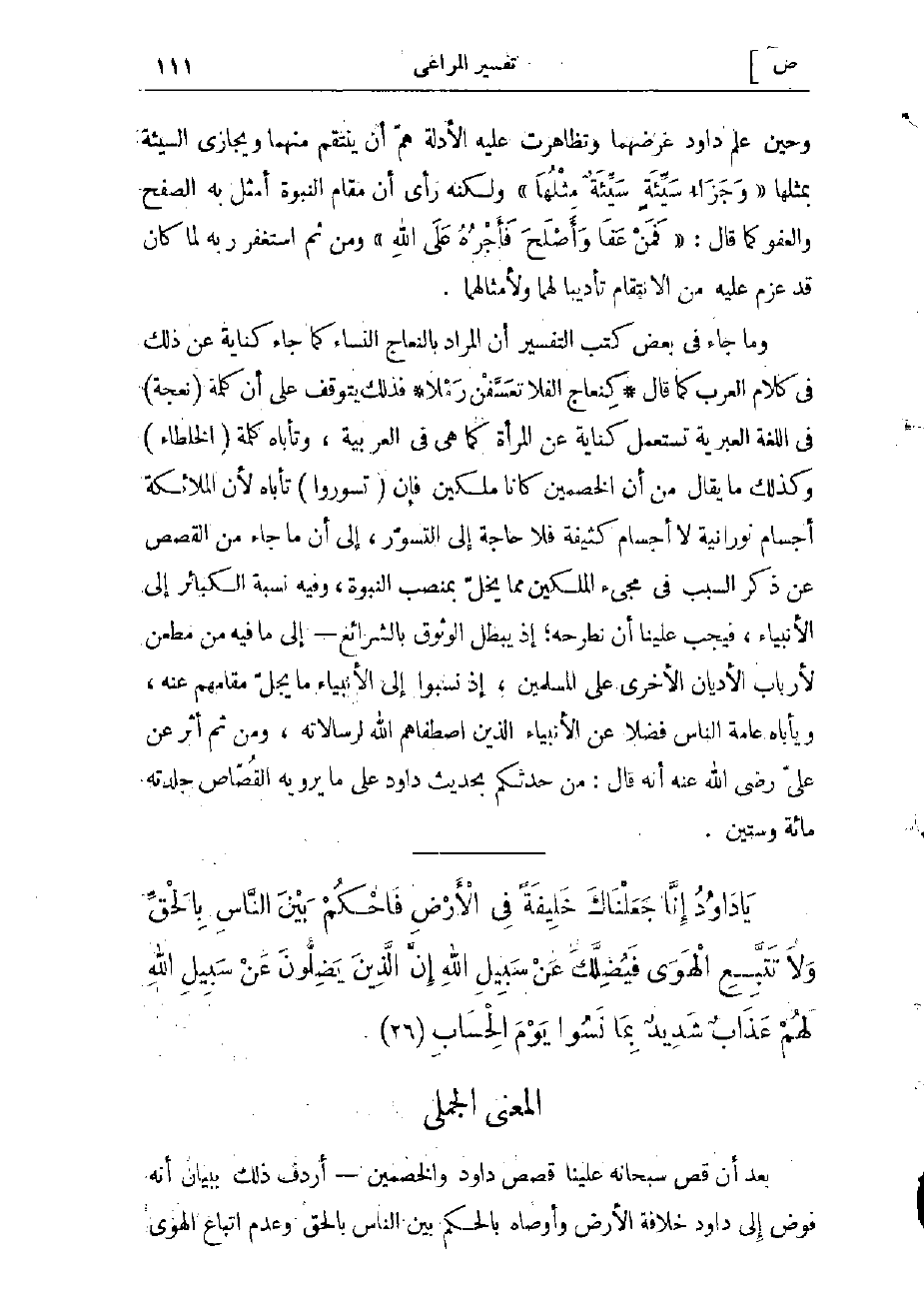 (نعجة) فى اللغة العبرية تستعمل كناية عن المرأة كما هى في العربية، وتأباه كلمة (الْخُلَطاءِ) وكذلك ما يقال من أن الخصمين كانا ملكين فإن (تَسَوَّرُوا) تأباه لأن الملائكة أجسام نورانية لا أجسام كثيفة فلا حاجة إلى التسوّر، إلى أنّ ما جاء من القصص عن ذكر السبب في مجىء الملكين مما يخلّ بمنصب النبوة، وفيه نسبة الكبائر إلى الأنبياء، فيجب علينا أن نطرحه إذ يبطل الوثوق بالشرائع- إلى ما فيه من مطعن لأرباب الأديان الأخرى على المسلمين، إذ نسبوا إلى الأنبياء ما يجلّ مقامهم عنه، ويأباه عامة الناس فضلا عن الأنبياء الذين اصطفاهم الله لرسالاته، ومن ثم أثر عن علىّ رضى الله عنه أنه قال: من حدّثكم بحديث داود على ما يرويه القصّاص جلدته مائة وستين.