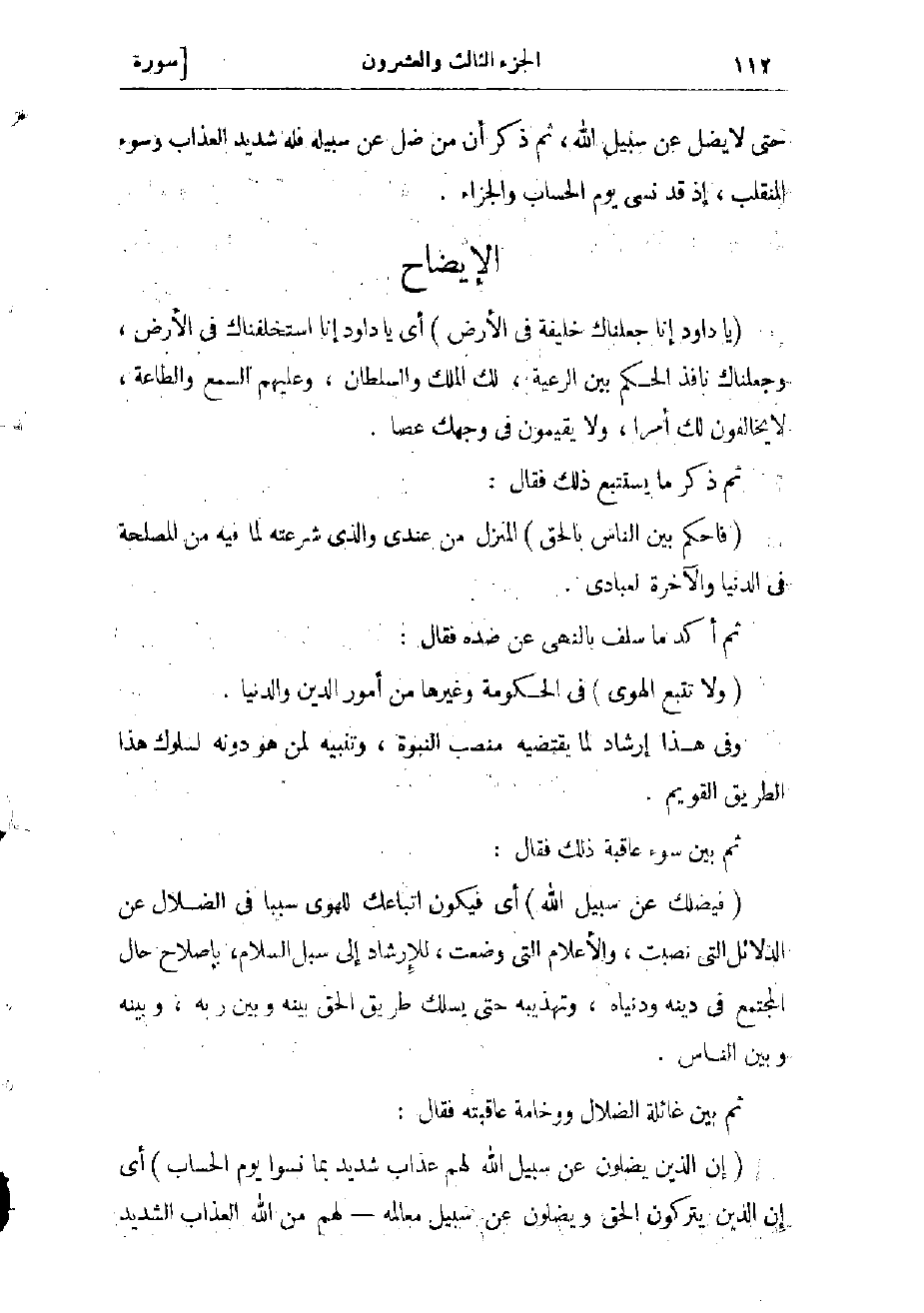(يا داوُدُ إِنَّا جَعَلْناكَ خَلِيفَةً فِي الْأَرْضِ) أي يا داود إنا استخلفناك في الأرض، وجعلناك نافذ الحكم بين الرعية، لك الملك والسلطان، وعليهم السمع والطاعة، لا يخالفون لك أمرا، ولا يقيمون في وجهك عصا.