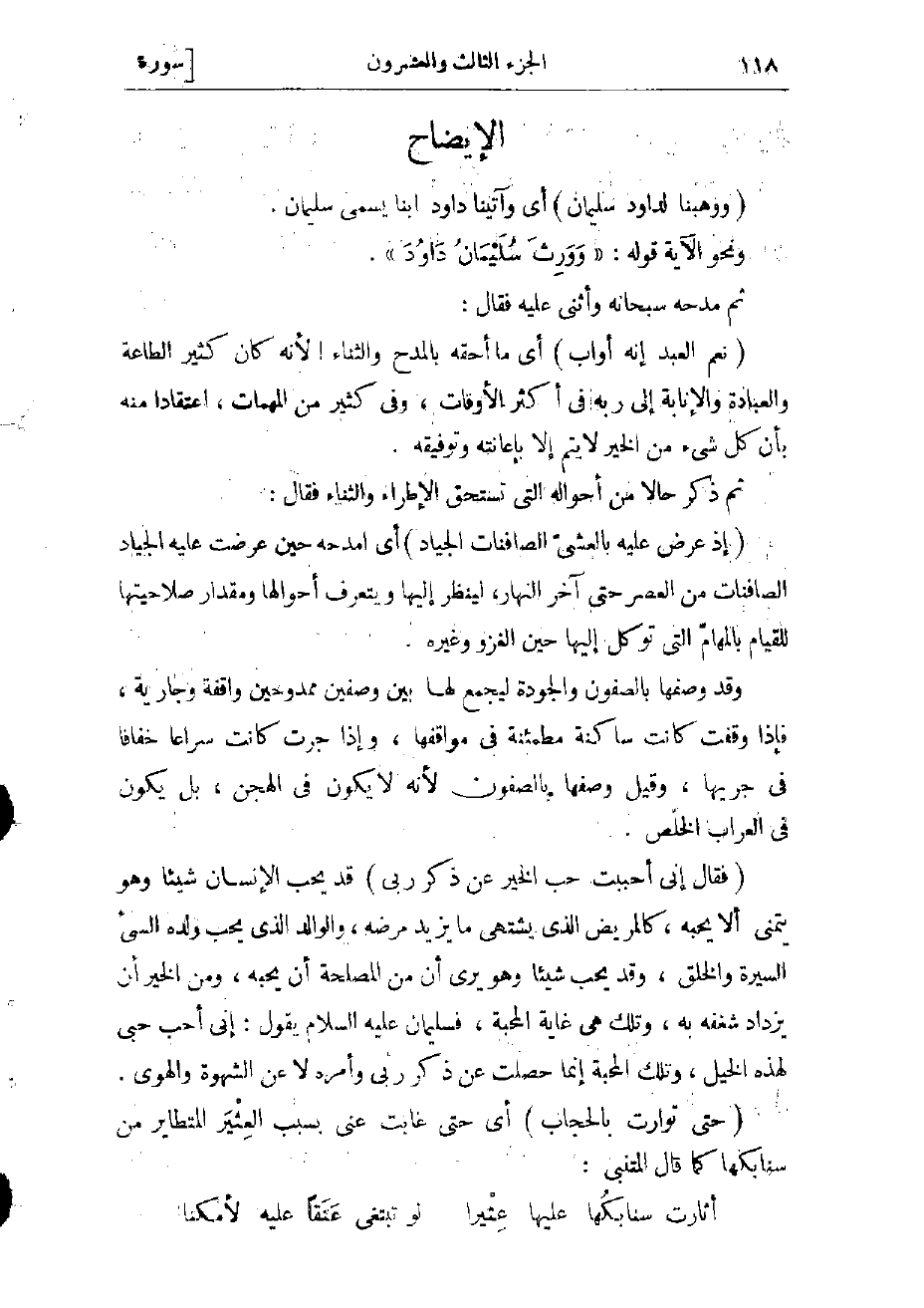 (فَقالَ إِنِّي أَحْبَبْتُ حُبَّ الْخَيْرِ عَنْ ذِكْرِ رَبِّي) قد يحب الإنسان شيئا وهو يتمنى ألا يحبه، كالمريض الذي يشتهى ما يزيد مرضه، والوالد الذي يحب ولده السيّء السيرة والخلق، وقد يحب شيئا وهو يرى أن من المصلحة أن يحبه، ومن الخير أن يزداد شغفه به، وتلك هى غاية المحبة، فسليمان عليه السلام يقول: إنى أحب حبى لهذه الخيل، وتلك المحبة إنما حصلت عن ذكر ربى وأمره لا عن الشهوة والهوى.