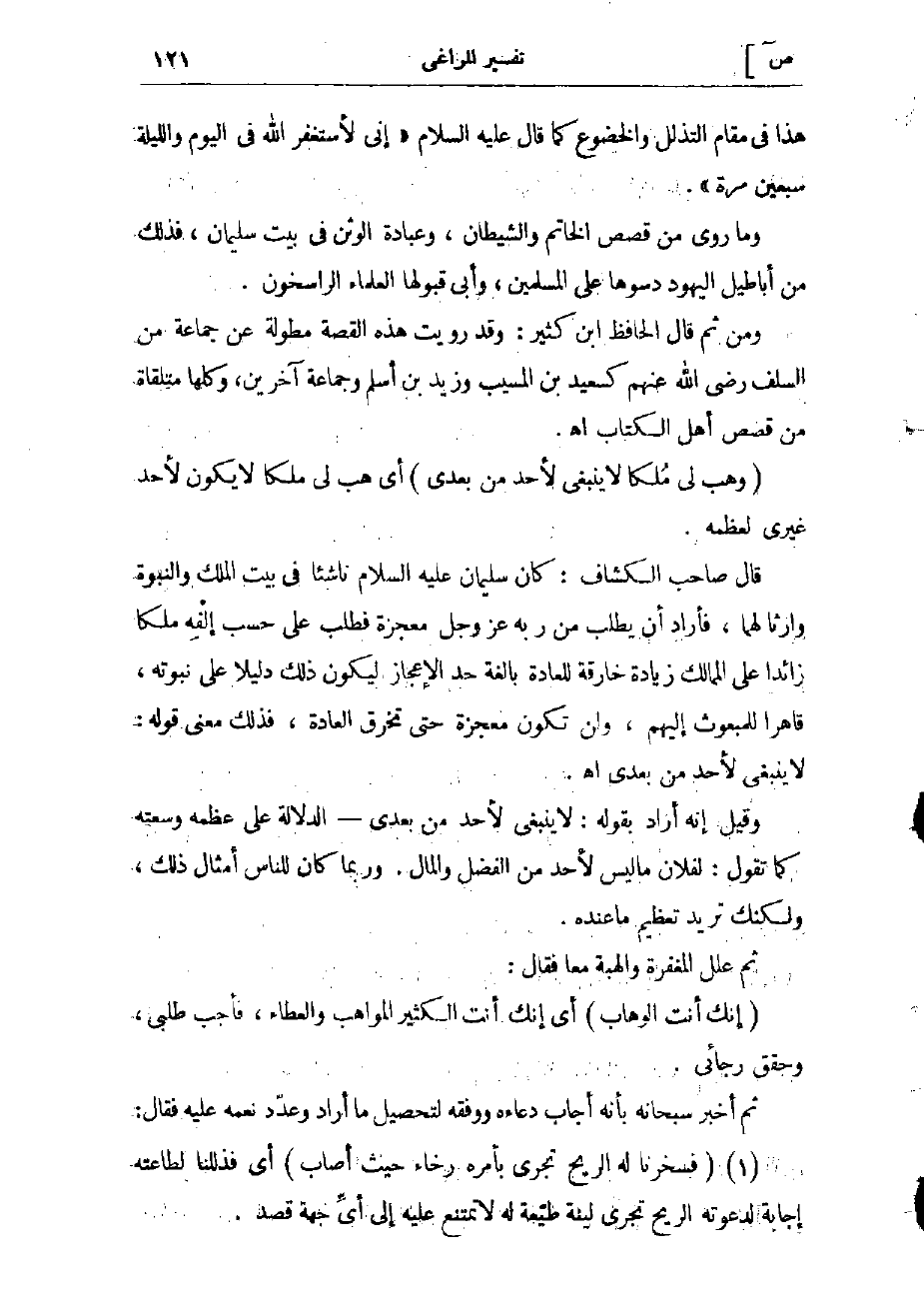 (1) (فَسَخَّرْنا لَهُ الرِّيحَ تَجْرِي بِأَمْرِهِ رُخاءً حَيْثُ أَصابَ) أي فذللنا لطاعته إجابة لدعوته الريح تجرى لينة طيّعة له لا تمتنع عليه إلى أىّ جهة قصد.