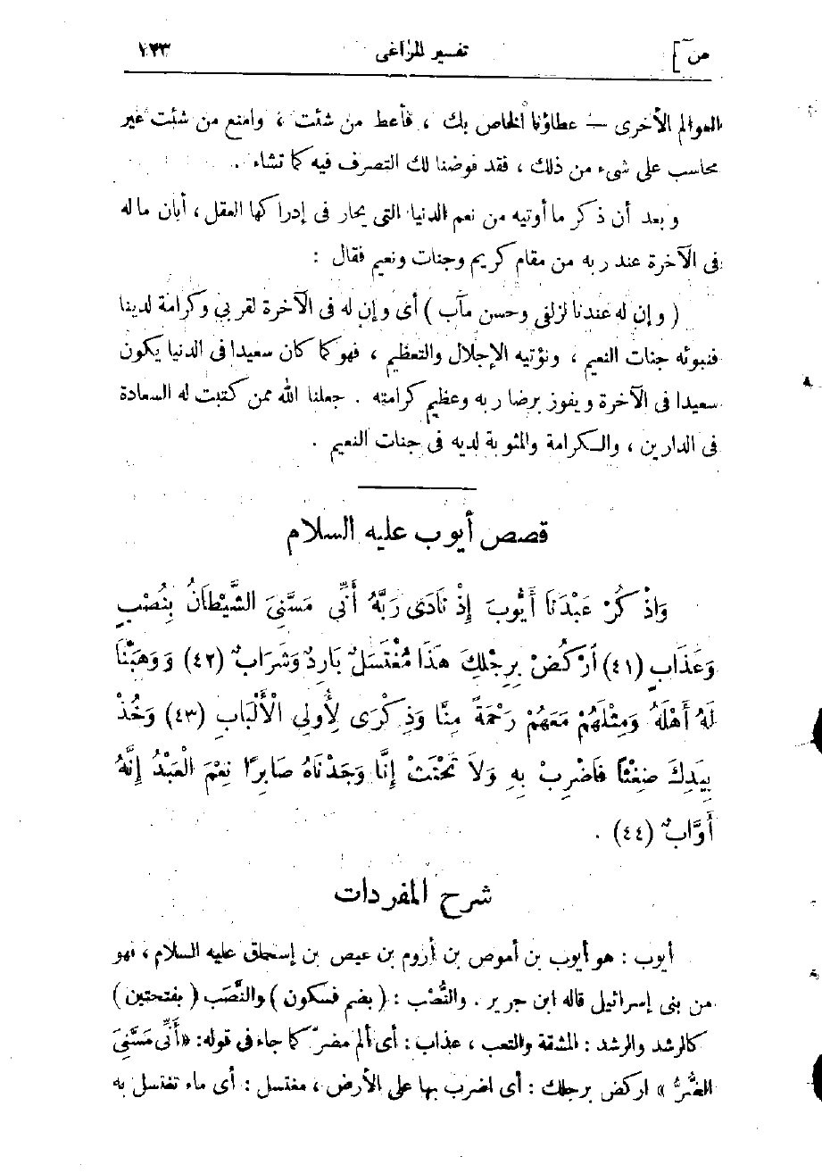 أيوب: هو أيوب بن أموص بن أروم بن عيص بن إسحاق عليه السلام، فهو من بنى إسرائيل قاله ابن جرير. والنّصب: (بضم فسكون) والنّصب (بفتحتين) كالرشد والرشد: المشقة والتعب، عذاب: أي ألم مضر كما جاء في قوله: «أَنِّي مَسَّنِيَ الضُّرُّ» اركض برجلك: أي اضرب بها على الأرض، مغتسل: أي ماء تغتسل به