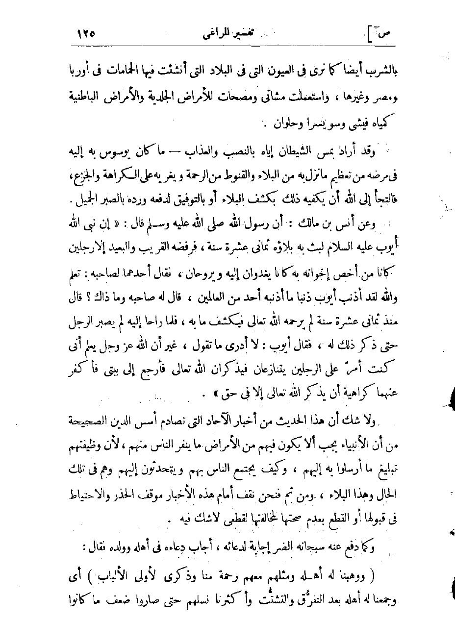 وعن أنس بن مالك: أن رسول الله صلّى الله عليه وسلم قال: «إن نبى الله أيوب عليه السلام لبث به بلاؤه ثمانى عشرة سنة، فرفضه القريب والبعيد إلا رجلين كانا من أخص إخوانه به كانا يغدوان إليه ويروحان، فقال أحدهما لصاحبه: تعلم والله لقد أذنب أيوب ذنبا ما أذنبه أحد من العالمين، قال له صاحبه وما ذاك؟ قال منذ ثمانى عشرة سنة لم يرحمه الله تعالى فيكشف ما به، فلما راحا إليه لم يصبر الرجل حتى ذكر ذلك له، فقال أيوب: لا أدرى ما تقول، غير أن الله عز وجل يعلم أنى كنت أمرّ على الرجلين يتنازعان فيذكران الله تعالى فأرجع إلى بيتي فأكفر عنهما كراهية أن يذكر الله تعالى إلا في حق» .