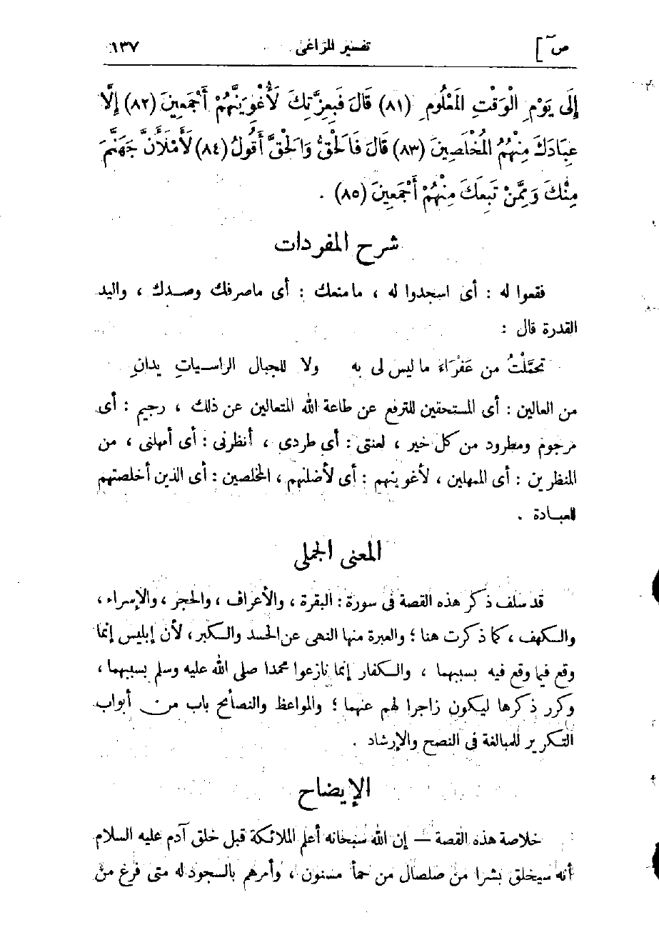 من العالين: أي المستحقين للترفع عن طاعة الله المتعالين عن ذلك، رجيم: أي مرجوم ومطرود من كل خير، لعنتى: أي طردى، أنظرنى: أي أمهلنى، من المنظرين: أي الممهلين، لأغوينهم: أي لأضلنهم، المخلصين: أي الذين أخلصتهم للعبادة.