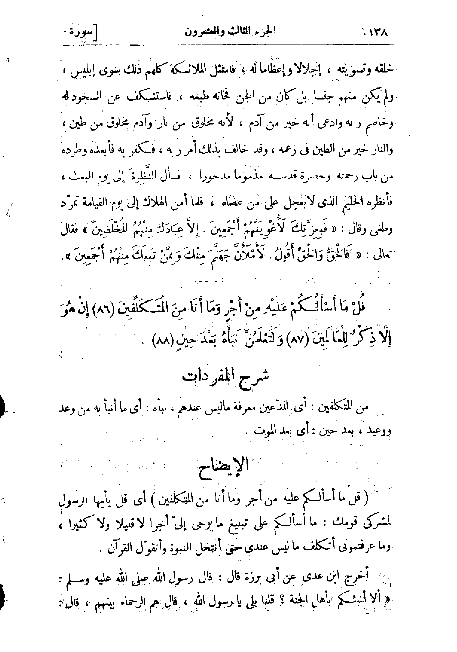 (قُلْ ما أَسْئَلُكُمْ عَلَيْهِ مِنْ أَجْرٍ وَما أَنَا مِنَ الْمُتَكَلِّفِينَ) أي قل يا أيها الرسول لمشركى قومك: ما أسألكم على تبليغ ما يوحى إلىّ أجرا لا قليلا ولا كثيرا، وما عرفتمونى أتكلف ما ليس عندى حتى أنتحل النبوة وأتقوّل القرآن.