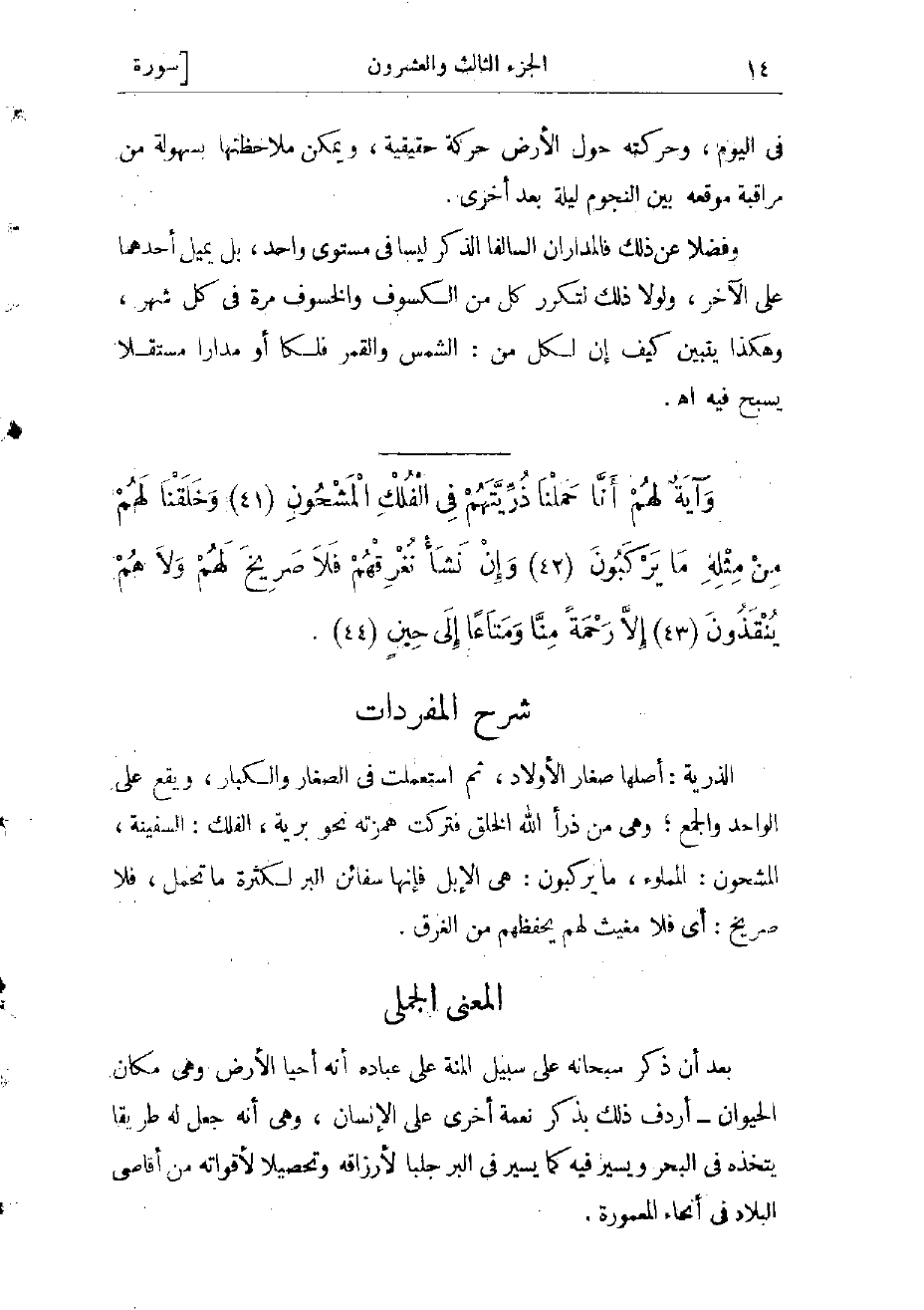 الذرية: أصلها صغار الأولاد، ثم استعملت في الصغار والكبار، ويقع على الواحد والجمع وهى من ذرأ الله الخلق فتركت همزته نحو بريّة، الفلك: السفينة، المشحون: المملوء، ما يركبون: هى الإبل فإنها سفائن البر لكثرة ما تحمل، فلا صريخ: