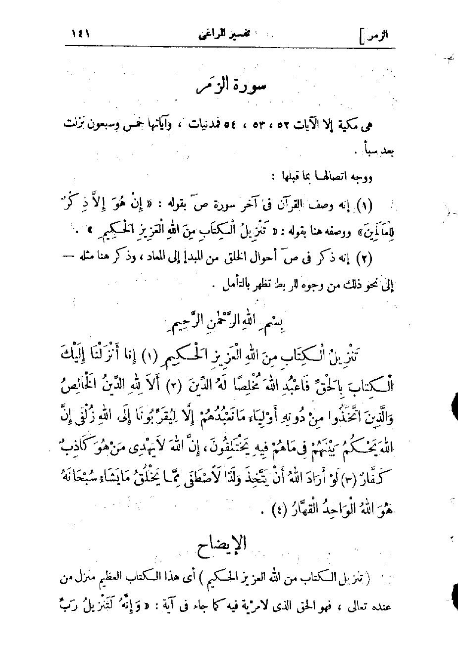 (1) إنه وصف القرآن في آخر سورة ص بقوله: «إِنْ هُوَ إِلَّا ذِكْرٌ لِلْعالَمِينَ» ووصفه هنا بقوله: «تَنْزِيلُ الْكِتابِ مِنَ اللَّهِ الْعَزِيزِ الْحَكِيمِ» .
