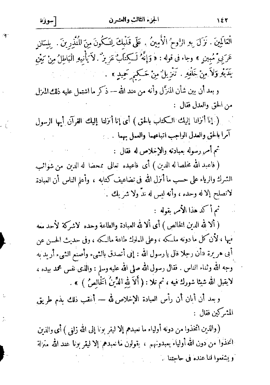 وفي حديث الحسن عن أبى هريرة «أن رجلا قال: يا رسول الله إنى أتصدق بالشيء وأصنع الشيء أريد به وجه الله وثناء الناس. فقال رسول الله صلّى الله عليه وسلم: والذي نفس محمد بيده، لا يقبل الله شيئا شورك فيه، ثم تلا: (أَلا لِلَّهِ الدِّينُ الْخالِصُ) » .