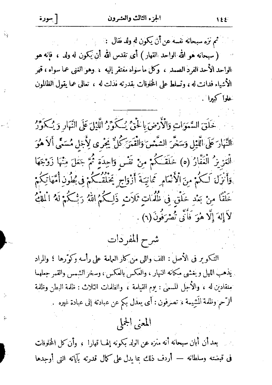التكوير: فى الأصل اللف واللى من كار العمامة على رأسه وكوّرها والمراد يذهب الليل ويغشى مكانه النهار، والعكس بالعكس، وسخر الشمس والقمر جعلهما منقادين له، والأجل المسمى: يوم القيامة، والظلمات الثلاث: ظلمة البطن وظلمة الرّحم وظلمة المشيمة، تصرفون: أي يعدل بكم عن عبادته إلى عبادة غيره.