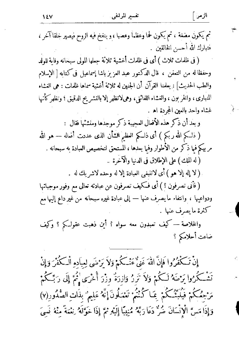 (فِي ظُلُماتٍ ثَلاثٍ) أي في ظلمات أغشية ثلاثة جعلها المولى سبحانه وقاية للولد وحفظا له من التعفن، قال الدكتور عبد العزيز باشا إسماعيل في كتابه [الإسلام والطب الحديث] : يعلمنا القرآن أن الجنين له ثلاثة أغشية سماها ظلمات: هى الغشاء المنبارى، والخربون، والغشاء اللفانفى، وهى لا تظهر إلا بالتشريح الدقيق، وتظهر كأنها غشاء واحد بالعين المجردة اهـ.