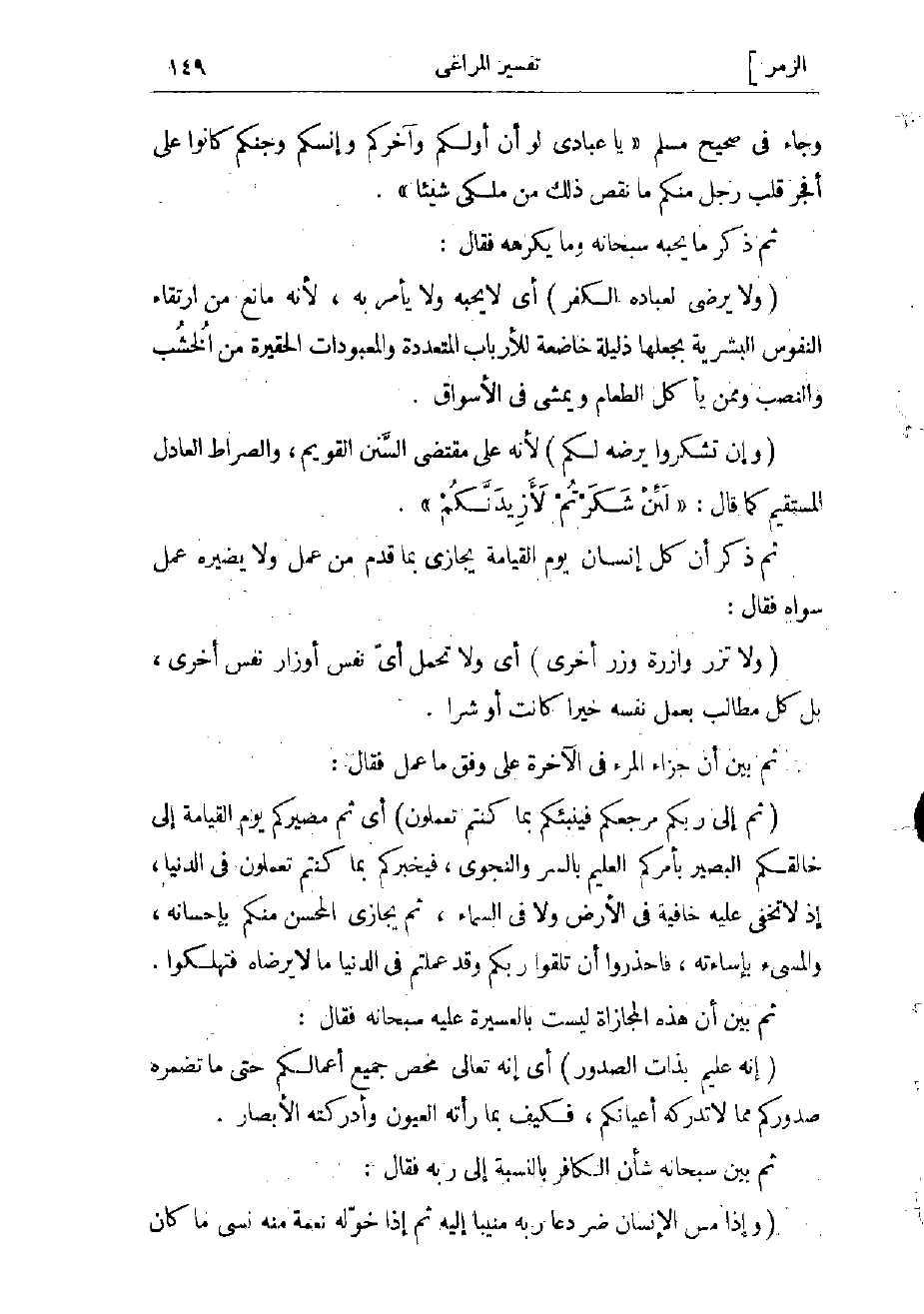 (وَلا يَرْضى لِعِبادِهِ الْكُفْرَ) أي لا يحبه ولا يأمر به، لأنه مانع من ارتقاء النفوس البشرية بجعلها ذليلة خاضعة للأرباب المتعددة والمعبودات الحقيرة من الخشب والنّصب وممن يأكل الطعام ويمشى في الأسواق.