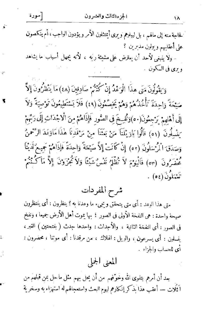 متى هذا الوعد: أي متى يتحقق ويجىء ما وعدنا به؟ ينظرون: أي ينتظرون، صيحة واحدة: هى النفخة الأولى في الصور بها يموت أهل الأرض جميعا، ونفخ فى الصور: أي النفخة الثانية، والأجداث: واحدها جدث (بفتحتين) القبر، ينسلون: أي يسرعون، والويل: الهلاك، من مرقدنا: أي موتنا، محضرون: أي للحساب والجزاء.