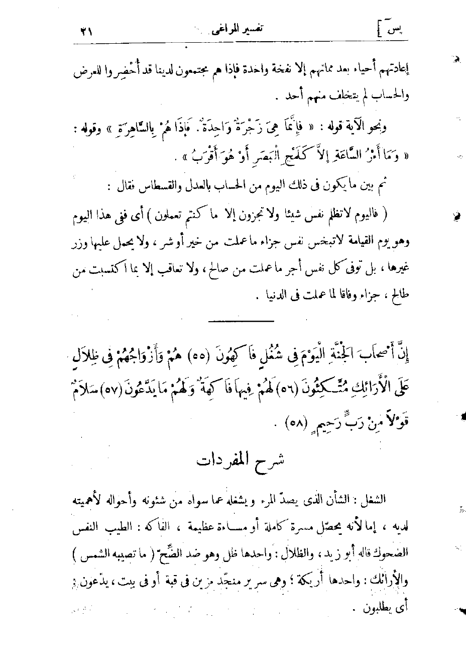 الشغل: الشأن الذي يصدّ المرء ويشغله عما سواه من شئونه وأحواله لأهميته لديه، إما لأنه يحصّل مسرة كاملة أو مساءة عظيمة، الفاكه: الطيب النفس الضحوك قاله أبو زيد، والظلال: واحدها ظل وهو ضد الضّح (ما تصيبه الشمس) والأرائك: