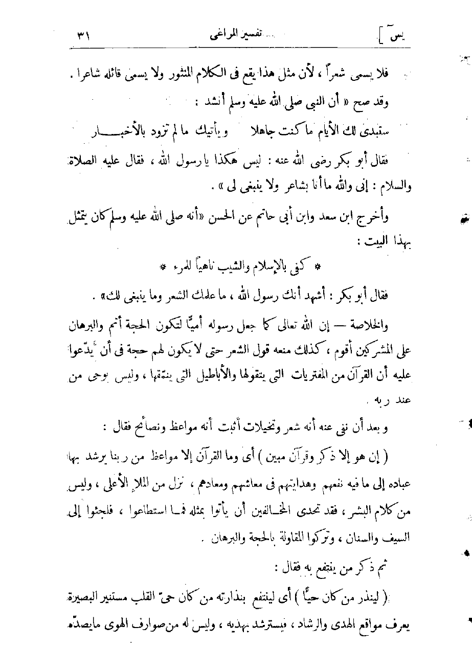 كفى بالإسلام والشيب ناهيا للمرء. والرواية: كفى الشيب والإسلام للمرء ناهيا فقال أبو بكر: أشهد إنك رسول الله، ما علمك الشعر وما ينبغى لك» .