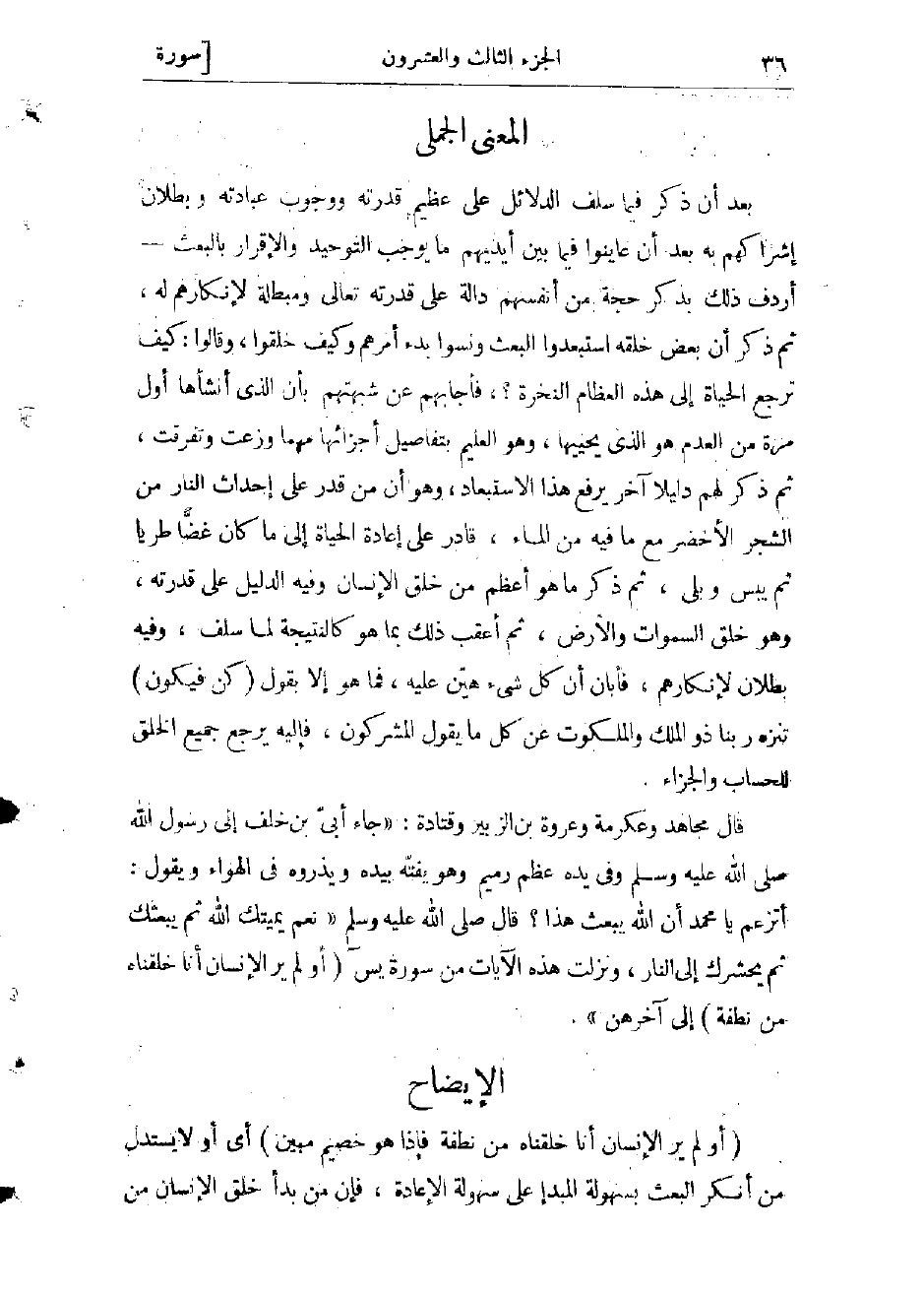 قال مجاهد وعكرمة وعروة بن الزبير وقتادة: «جاء أبىّ بن خلف إلى رسول الله صلى الله عليه وسلم وفي يده عظم رميم وهو يفتّه بيده ويذروه في الهواء ويقول: أتزعم يا محمد أن الله يبعث هذا؟ قال صلّى الله عليه وسلم «نعم يميتك الله ثم يبعثك ثم يحشرك إلى النار، ونزلت هذه الآيات من سورة يس (أَوَلَمْ يَرَ الْإِنْسانُ أَنَّا خَلَقْناهُ مِنْ نُطْفَةٍ) إلى آخرهن» .