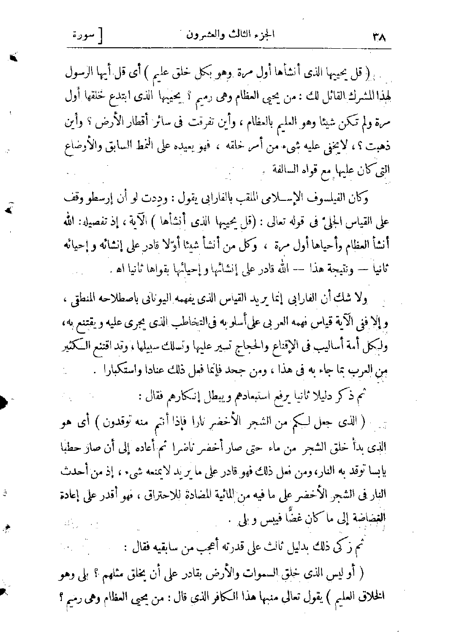 وكان الفيلسوف الإسلامى الملقّب بالفارابي يقول. وددت لو أن أرسطو وقف على القياس الجلىّ في قوله تعالى: (قُلْ يُحْيِيهَا الَّذِي أَنْشَأَها) الآية، إذ تفصيله: الله أنشأ العظام وأحياها أول مرة، وكل من أنشأ شيئا أولا قادر على إنشائه وإحيائه ثانيا- ونتيجة هذا- الله قادر على إنشائها وإحيائها بقواها ثانيا اهـ.