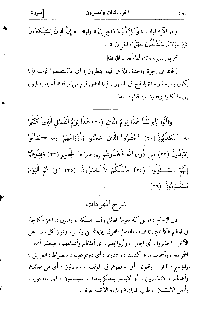 الطريق، والجحيم: النار، وقفوهم: أي احبسوهم في الموقف، مسئولون: أي عن عقائدهم وأعمالهم، لا تناصرون: أي لا ينصر بعضكم بعضا، مستسلمون: أي منقادون وأصل الاستسلام: طلب السلامة ويلزمه الانقياد عرفا.