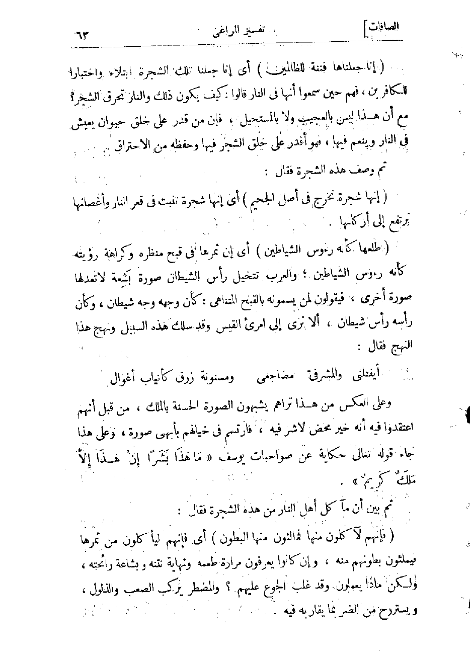 (طَلْعُها كَأَنَّهُ رُؤُسُ الشَّياطِينِ) أي إن ثمرها في قبح منظره، وكراهة رؤيته، كأنه رءوس الشياطين والعرب تتخيل رأس الشيطان صورة بشعة لا تعدلها صورة أخرى، فيقولون لمن يسمونه بالقبح المتناهي: كأن وجهه وجه شيطان، وكأن رأسه رأس شيطان، ألا ترى إلى امرئ القيس وقد سلك هذا السبيل، ونهج هذا النهج فقال: