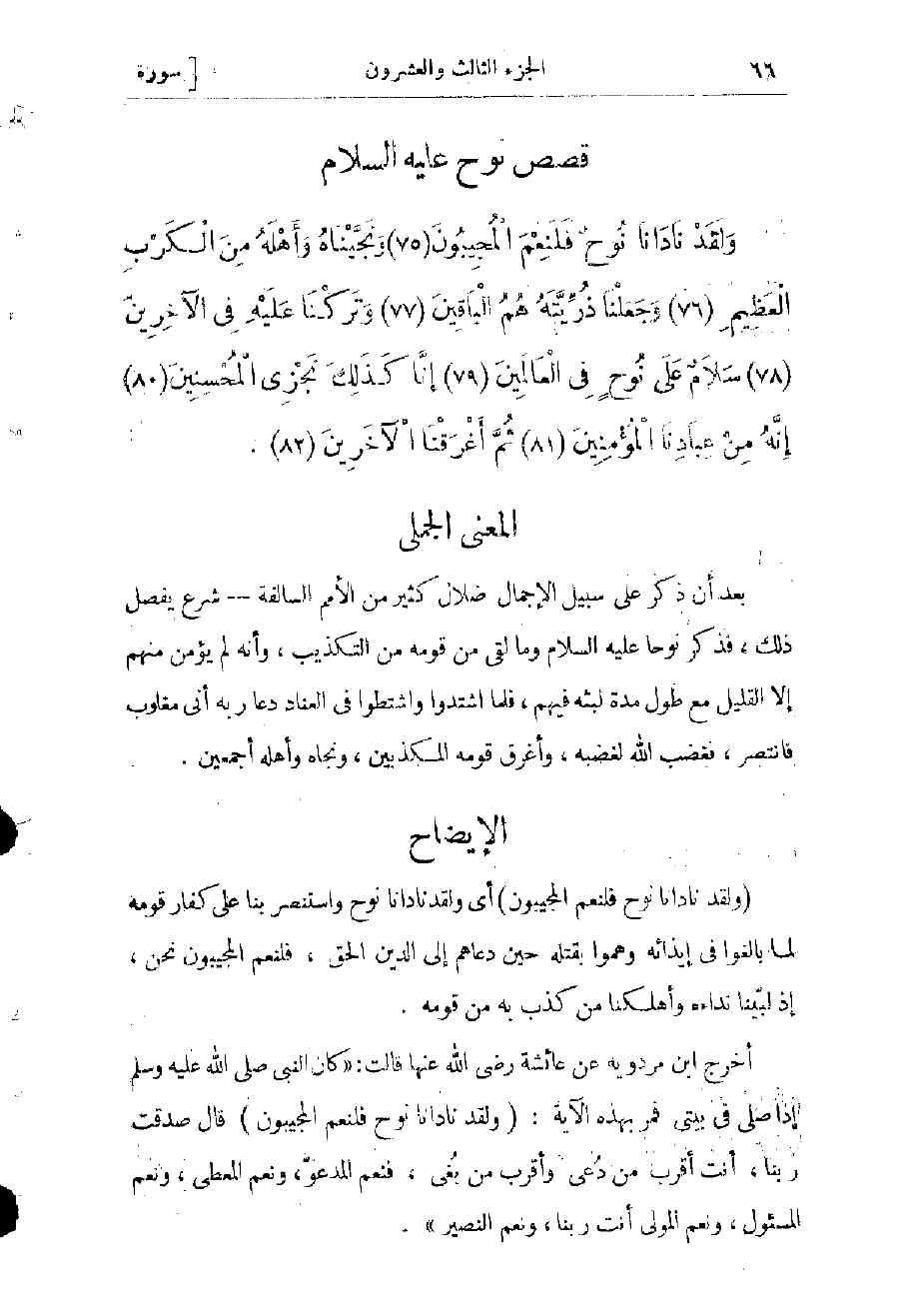 أخرج ابن مردويه عن عائشة رضى الله عنها قالت: «كان النبي صلّى الله عليه وسلم إذا صلّى في بيتي فمر بهذه الآية: (وَلَقَدْ نادانا نُوحٌ فَلَنِعْمَ الْمُجِيبُونَ) قال صدقت ربنا، أنت أقرب من دعى، وأقرب من بغى، فنعم المدعوّ، ونعم المعطى، ونعم المسئول، ونعم المولى أنت ربنا، ونعم النصير» .