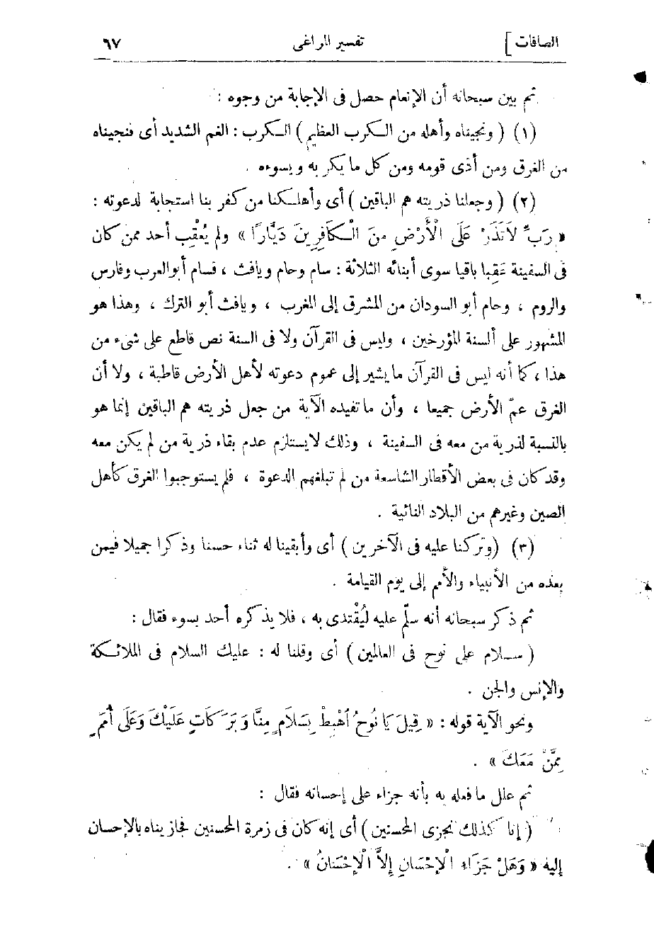 «رَبِّ لا تَذَرْ عَلَى الْأَرْضِ مِنَ الْكافِرِينَ دَيَّاراً» ولم يعقب أحد ممن كان فى السفينة عقبا باقيا سوى أبنائه الثلاثة: سام وحام ويافث، فسام أبو العرب وفارس والروم، وحام أبو السودان من المشرق إلى المغرب، ويافث أبو الترك، وهذا هو المشهور على ألسنة المؤرخين، وليس في القرآن ولا في السنة نص قاطع على شىء من هذا، كما أنه ليس في القرآن ما يشير إلى عموم دعوته لأهل الأرض قاطبة، ولا أن الغرق عمّ الأرض جميعا، وأن ما تفيده الآية من جعل ذريته هم الباقين إنما هو بالنسبة لذرية من معه فى السفينة، وذلك لا يستلزم عدم بقاء ذرية من لم يكن معه وقد كان في بعض الأقطار الشاسعة من لم تبلغهم الدعوة، فلم يستوجبوا الغرق كأهل الصين وغيرهم من البلاد النائية (3) (وَتَرَكْنا عَلَيْهِ فِي الْآخِرِينَ) أي وأبقينا له ثناء حسنا وذكرا جميلا فيمن بعده من الأنبياء والأمم إلى يوم القيامة.