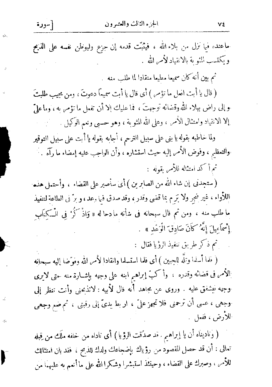 (قالَ يا أَبَتِ افْعَلْ ما تُؤْمَرُ) أي قال يا أبت سميعا دعوت، ومن مجيب طلبت، وإلى راض ببلاء الله وقضائه توجهت، فما عليك إلا أن تفعل ما تؤمر به، وما على إلا الانقياد وامتثال الأمر، وعلى الله المثوبة، وهو حسبى ونعم الوكيل.