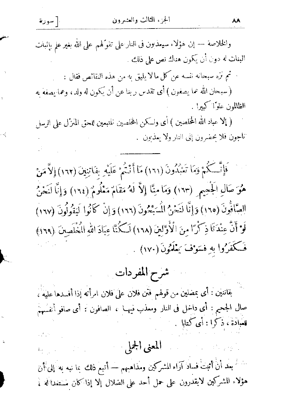 بفاتنين: أي بمضلين من قولهم فتن فلان على فلان امرأته إذا أفسدها عليه، صال الجحيم: أي داخل في النار ومعذب فيها، الصافون: أي صافو أنفسهم للعبادة، ذكرا: أي كتابا