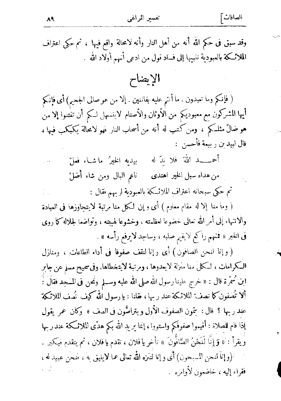 وفي صحيح مسلم عن جابر بن سمرة قال: «خرج علينا رسول الله صلّى الله عليه وسلم ونحن في المسجد فقال: ألا تصفّون كما تصفّ الملائكة عند ربها، فقلنا: يا رسول الله كيف تصفّ الملائكة عند ربها؟