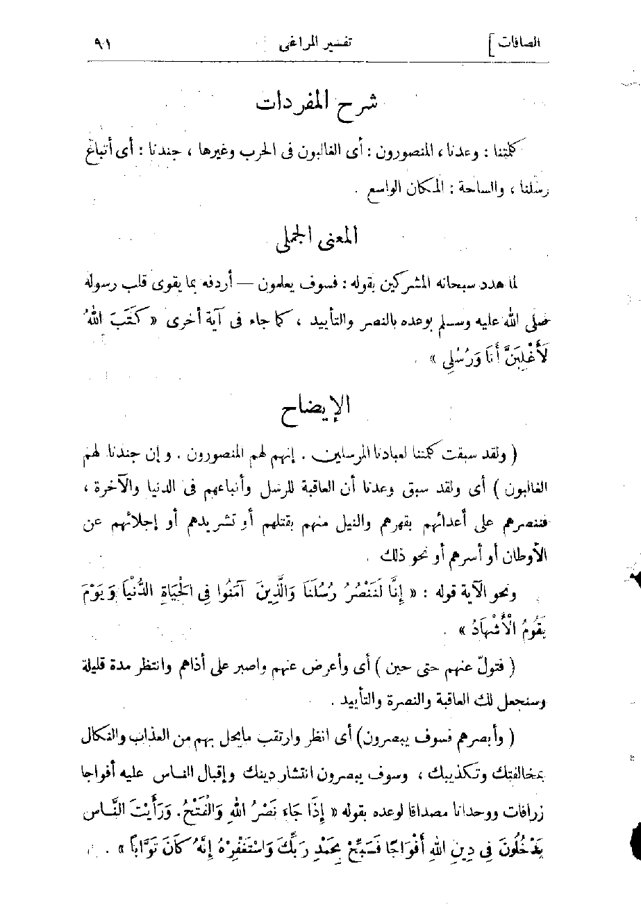 (وَلَقَدْ سَبَقَتْ كَلِمَتُنا لِعِبادِنَا الْمُرْسَلِينَ. إِنَّهُمْ لَهُمُ الْمَنْصُورُونَ. وَإِنَّ جُنْدَنا لَهُمُ الْغالِبُونَ) أي ولقد سبق وعدنا أن العاقبة للرسل وأتباعهم في الدنيا والآخرة، فننصرهم على أعدائهم بقهرهم والنيل منهم، بقتلهم أو تشريدهم أو إجلائهم عن الأوطان أو أسرهم أو نحو ذلك.