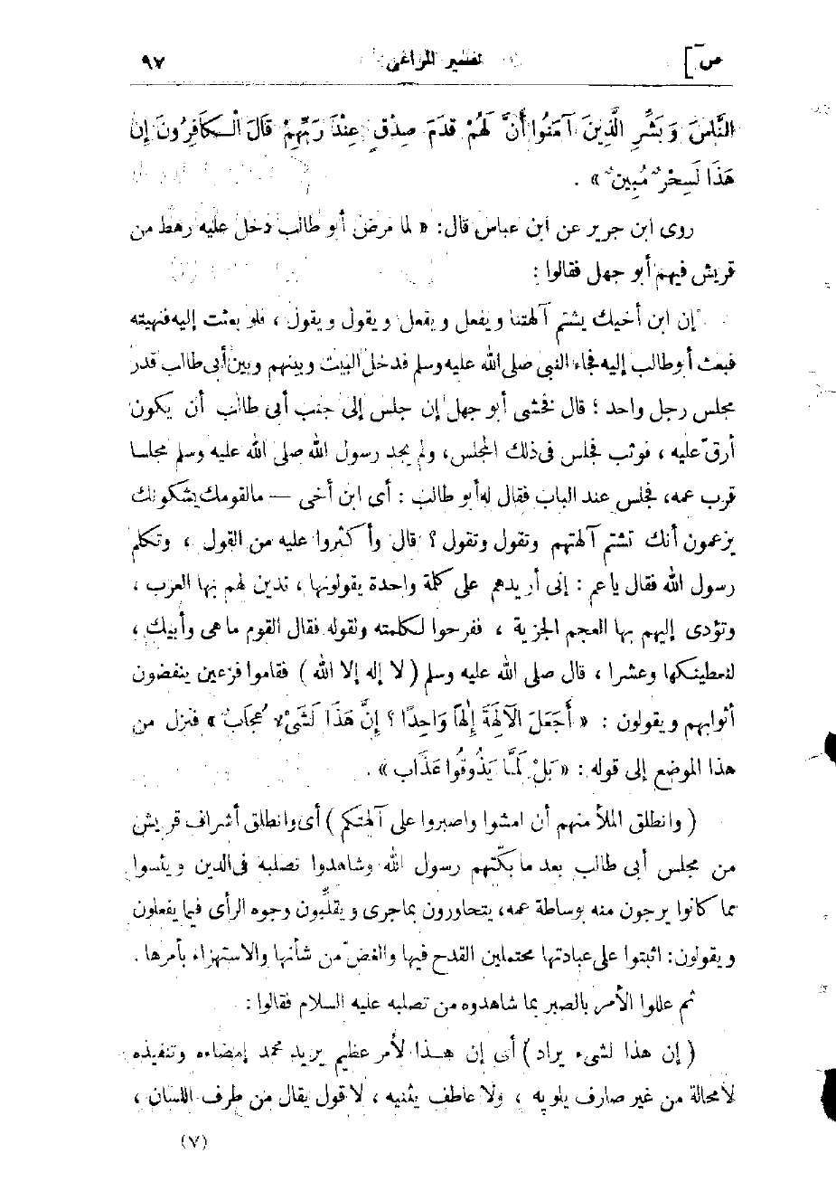 روى ابن جرير عن ابن عباس قال: «لما مرض أبو طالب دخل عليه رهط من قريش فيهم أبو جهل فقالوا: إن ابن أخيك يشتم آلهتنا ويفعل ويفعل ويقول ويقول، فلو بعثت إليه فنهيته، فبعث أبو طالب إليه فجاء النبي صلّى الله عليه وسلم فدخل البيت وبينهم وبين أبى طالب قدر مجلس رجل واحد، قال فخشى أبو جهل إن جلس إلى جنب أبى طالب أن يكون أرقّ عليه، فوثب فجلس في ذلك المجلس، ولم يجد رسول الله صلى الله عليه وسلم مجلسا قرب عمه، فجلس عند الباب فقال له أبو طالب: أي ابن أخى ما لقومك يشكونك يزعمون أنك تشتم آلهتهم وتقول وتقول؟ قال وأكثروا عليه من القول، وتكلم رسول الله فقال يا عم: إنى أريدهم على كلمة واحدة يقولونها، تدين لهم بها العرب، وتؤدى إليهم بها العجم الجزية، ففرحوا لكلمته ولقوله فقال القوم ما هى وأبيك، لنعطينّكها وعشرا، قال صلّى الله عليه وسلم (لا إِلهَ إِلَّا اللَّهُ) فقاموا فزعين ينفضون أثوابهم ويقولون: «أَجَعَلَ الْآلِهَةَ إِلهاً واحِداً؟ إِنَّ هذا لَشَيْءٌ عُجابٌ» فنزل من هذا الموضع إلى قوله: «بَلْ لَمَّا يَذُوقُوا عَذابِ» .