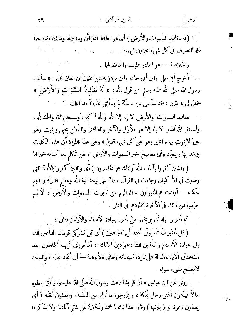 أخرج أبو يعلى وابن أبي حاتم وابن مردويه عن عثمان قال: «سألت رسول الله صلى الله عليه وسلم عن قول الله: «لَهُ مَقالِيدُ السَّماواتِ وَالْأَرْضِ» فقال لى يا عثمان: